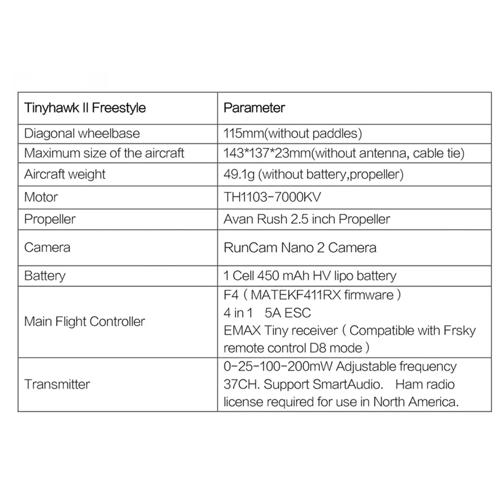 Рамка: Колесная база: 115 мм Сухой Вес: 49 г Все вверх Вес: 79 г с 2 аккумуляторами 450 мАч 1S Рамка Материал: углеродное волокно Моторы: Статор Размер: 1103 КВ: 7000 кв Крепление пропеллера: Т-образное крепление, вал 1,5 мм Пропеллер: Avan Rush 2,5" Контроллер полета «Все в одном» (AIO): Полет Контроллер: F4 (прошивка MATEKF411RX) ESC: 4-в-1 5A BlHeli_S Приемник: приемник EMAX SPI (совместим с режимом FrSky D8) Разъем аккумулятора: JST-PH2.0-Duo FPV Система: VTX Мощность: 25/100/200 МВт с возможностью переключения (устанавливается на 25 МВт до вооруженного) * Каналы: 37CH вкл. Raceband Камера: RunCam Nano 2 1/3 "700TVL CMOS SМарт Аудио подключено Аккумулятор: 1 ячейка 450 мАч HV lipo аккумулятор Время полета: 3-5 минут