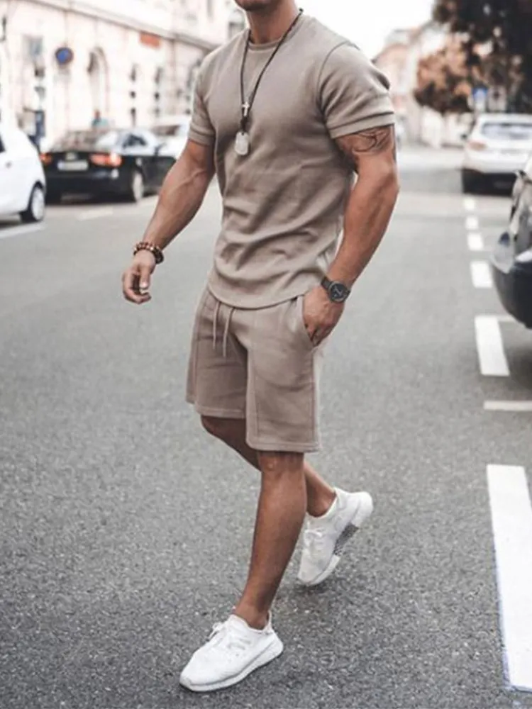 Мужской повседневный комплект из топа с коротким рукавом, круглым вырезом и шортов на шнуровке