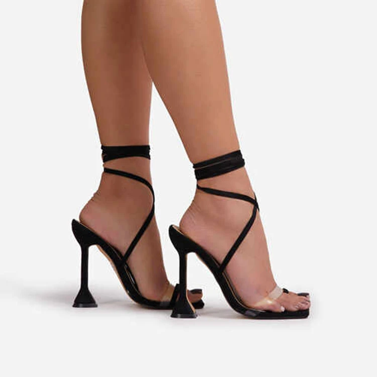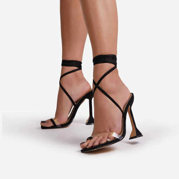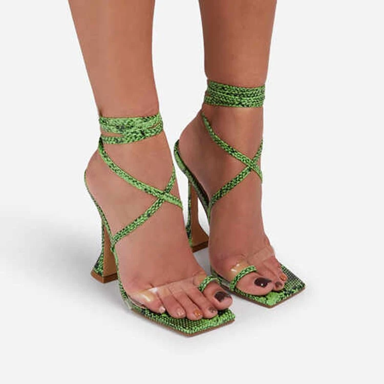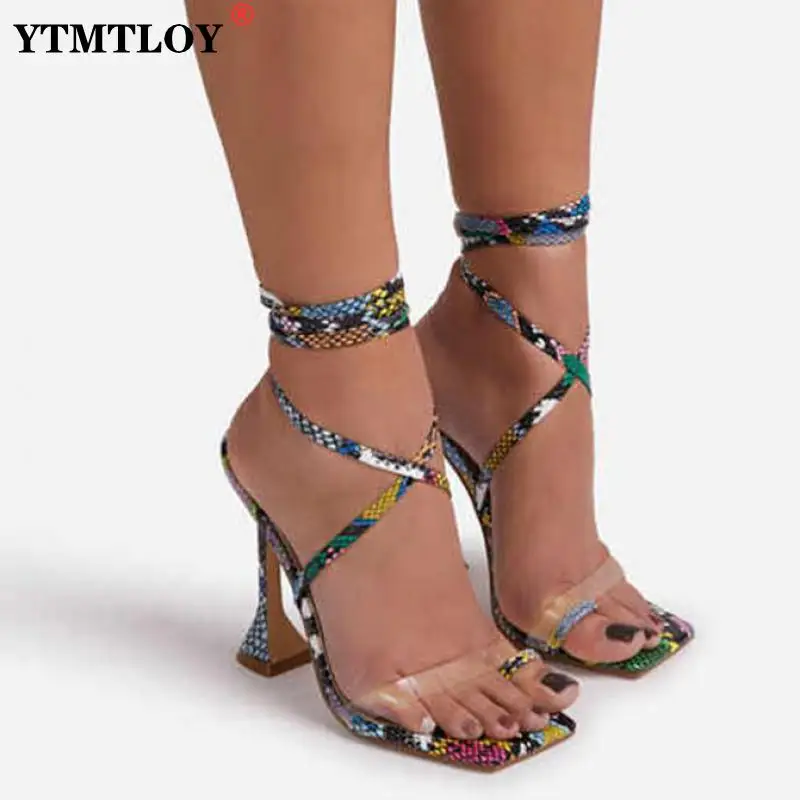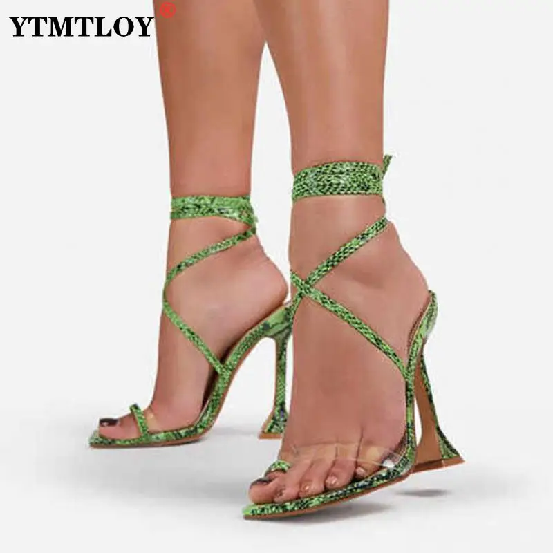Сандалии женские на высоком каблуке, босоножки-гладиаторы со змеиным принтом, на шнуровке, с перекрестными ремешками, пикантная прозрачная обувь со стеклянным каблуком