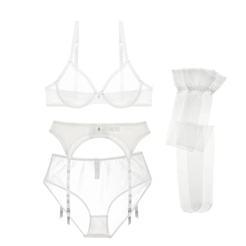 Комплект женского нижнего белья Varsbaby, комплект из 4 предметов, ультратонкий сетчатый прозрачный бюстгальтер + трусики с высокой посадкой + кружевной пояс + чулки, черный