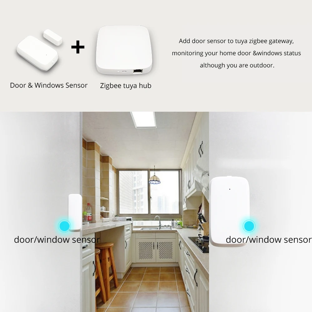 Датчик дверей и окон:Датчик двери и окна обнаруживает открытие или закрытие дверей и окон и контролирует состояние вашей домашней двери и окон, даже если вас нет дома. Также он должен работать вместе с другими устройствами для разработки и реализации сценариев смарт-приложений.Внимание: Убедитесь, что дверной магнит расположен на стороне знака выравнивания.