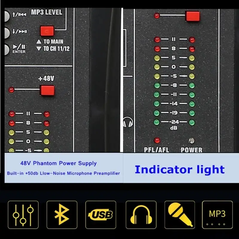 Особенности:-12 каналов микшерный пульт с XLR Сделано в Китае, линейных входов и 48В.-Каждый канал имеет коэффициент усиления, 3-полосный/AUX кабель/USB кабель, эффект, PAN ручки управления и регулятор громкости фейдера.-Переключатель PEL позволяет следить за каналом, который включён только «Вкл».-AUX отправка и возврат гнезда для подключения всех видов эффектов извне.-С XLR(L/ R) и 1/4 "(L/ R) стерео выходными гнездами и REC(L/ R) и интерфейсами гарнитуры.-С входным интерфейсом USB и ЖК-дисплеем, а также кнопками управления.-С индикатором уровня мощности и выхода для легкого мониторинга и работы.-Уровень эффекта и вывод основных фейдеров, повтор, EFF отправка, задержка, отправка, Обратные ручки на мастер-разделе.