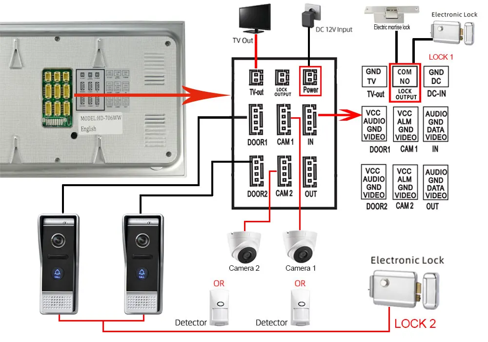 Этот набор поддерживает подключение 2 электронных замка в основном, после подключения электронного замка, вы можете использовать приложение или монитор, чтобы открыть дверь. Когда вы находитесь наверху, в саду или даже если вы не дома, вы можете дистанционно разблокировать дверь электрического замка для своих друзей и семьи через бесплатное приложение