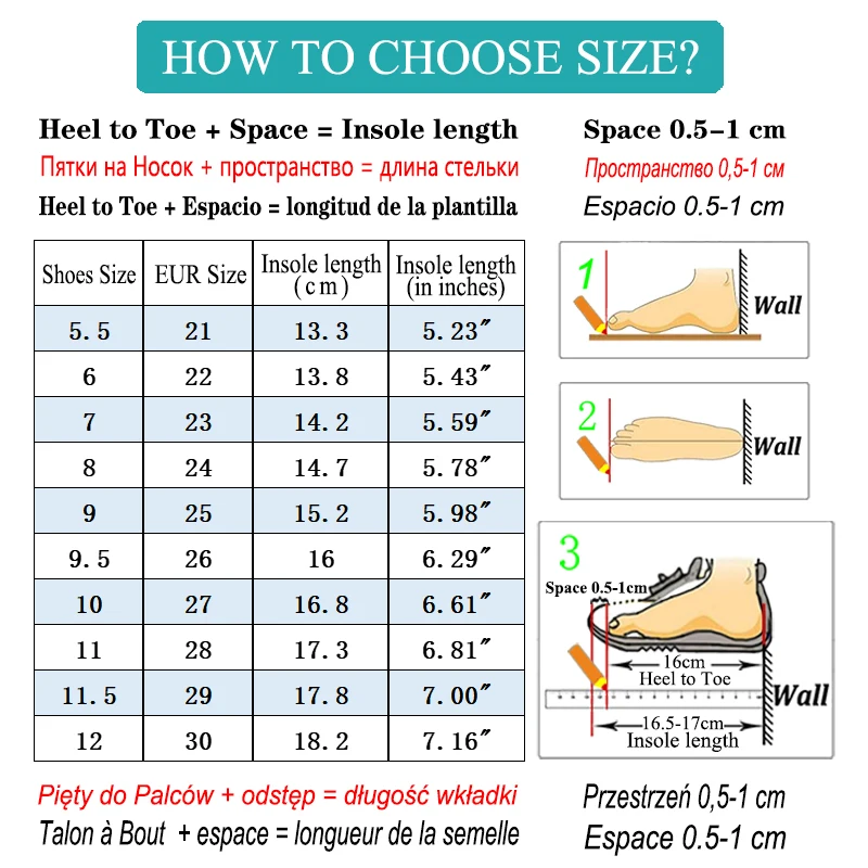 1. Стопы Длина + (0,5 ~ 1 см) = стелька Длина. 2. Допускается погрешность в 1-3 мм из-за ручного измерения. 3. Измерьте длину стопы и обратитесь к таблице размеров ниже, чтобы определить, какой размер вы должны приобрести. 4. Если вы не знаете, как выбрать, пожалуйста, сообщите нам длину вашей стопы, мы выберем размер для вас.