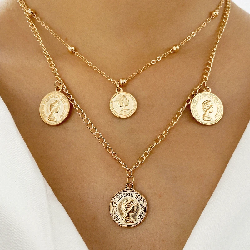 Многослойное длинное ожерелье из золотых монет для женщин с цветочным принтом цепи браслеты с подвесками портрет подвески ожерелья 2020, модная новинка, ювелирное изделие, подарок