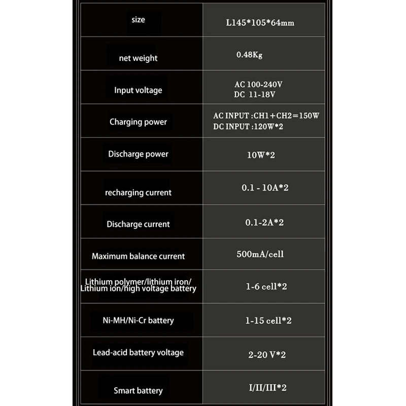 Вход: 100-240 В переменного тока/11-18 В постоянного токаМощность заряда: режим переменного тока 150 Вт (CH1 + CH2 = 150 Вт), режим постоянного тока 120 Вт * 2 = 240 ВтМощность разряда: макс. 10 Вт * 2Диапазон тока заряда: 0,1-10 А * 2Диапазон тока разряда:-2 А * 2Количество ячеек Lilon/LiPo/LiFe/LiHV: 1-6 ячеек * 2Количество ячеек NiCd/NiMH: 1-15 ячеек * 2Напряжение аккумулятора PB: 2-20 в * 2Умная Батарея: I/II/III * 2Расход тока для балансировки: 500 мА/ячейкаТип вилки: вилка европейского стандарта, подходит для Индонезии, Германии, Франции, Испании, Италии и т. д.Цвет: черныйМатериал: пластик + металлРазмер: 14,5x10,5x6,4 смПосылка1 зарядное устройство1 комплект аксессуаров1 x Руководство на китайском и английском языкахВ комплект входит только указанное выше содержимое, другие продукты в комплект не входят.Примечание: светильник вая съемка и различные дисплеи могут привести к тому, что цвет товара на изображении будет немного отличаться от реального. Допустимая погрешность измерения +/- 1-3 см.