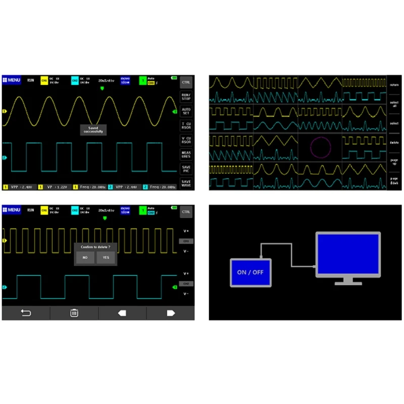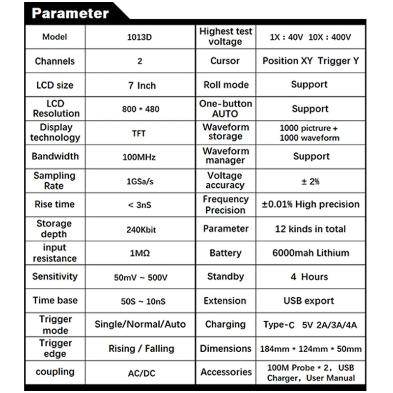 Новый FNIRSI-1013D сенсорный экран мини планшет Многофункциональный двухканальный 100 м полоса пропускания 1GS частота дискретизации цифровой планшет E06D100% новый и высокое качествоFNIRSI-1013D-это полнофункциональный, практичный, экономичный двухканальный плоский осциллограф, запущенный FNIRSI для обслуживания и R & D промышленности; этот осциллограф имеет частоту дискретизации в реальном времени 1GSa / s и аналоговую пропускную способность 100 МГц * 2. С полной функцией триггера (одиночный/Нормальный/автоматический), его можно использовать свободно для периодического аналогового сигнала или непериодического цифрового сигнала; встроенный модуль защиты высокого напряжения может выдерживать Непрерывное напряжение до 400 В. ДТП осциллографа, вызванный поворотом зонда в положение 10X. Режим Прокрутки с большой базой времени может контролировать изменения медленного уровня; Оснащен высокоэффективным одним ключом, который может отображать измеренную форму волны без утомительных настроек; дисплей с диагональю 7 дюймов 800*480 разрешение высокой четкости ЖК-дисплей Экран и метод работы конденсатор с алюминиевой крышкой, Экран сенсорный экран + жест операции, очень удобно; Функция измерения курсора, вам не нужно читать блок фоновой шкалы и количество при ручном считывании амплитудных и частотных параметров, и вы можете напрямую получить пиковую, пиковую и частоту без преобразования; чрезвычайно удобный скриншот и функция хранения сигналов, встроенный объем памяти 1 Гб, Может хранить до 1000 скриншотов + 1000 наборов данных волноводной формы, процесс хранения прост и быстр, сохраняет форму тока в любое время-, в любом месте с одним касанием, без громоздких подсказок и выбора, сохраняйте спокойствие, сохраняя текущие данные в месте, которое очень удобно; Мощный Графический менеджер поддерживает просмотр, просмотр, Детальный просмотр, поворот страницы, удаление и масштабирование формы волны, масштабирование, перемещение и т. Д., чтобы облегчить вторичный анализ. Фюзеляж оснащен интерфейсом USB, который может быть подключен к компьютеру, чтобы поделиться своими скриншотами с компьютером, что удобно для вторичного анализа; функция графического дисплея Lissajous может использоваться для определения амплитуды, частоты и фазового контраста двух групп сигналов; Анализ гармонических компонентов сигнала; Встроенный литий-ионный аккумулятор высокого качества 6000 мАч, который может работать в течение 4 часов при полной зарядке и может использоваться во время зарядки, как ноутбукОсобенности:1: интеллектуальная защита от ожогов, 1X Выдерживает напряжение до 400 В2: аналоговая полоса пропускания 100 МГц @ частота дискретизации 1GSa/s (1X = 5 МГц, 10X = 100 МГц)3: полностью подходит для 7 дюймов 800*480 цветной TFT ЖК-дисплей с яркими цветами и высокой контрастностью4: емкостный сенсорный экран, такой же, как и Сенсорный режим современного мобильного ipad-это не резистивный сенсорный экран с древней операцией ногтей5: Диапазон высокого напряжения, 1x может измерить 0 ~ 40 В, 10x может измерить 0 ~ 400 В, 100x может измерить 0 ~ 4000 в6: до 12 параметров измерения: VPP,VP,Vmax,Vmin,Vavg,Vrms, частые, Duty +,Duty-,Time +,Time-,Period7: Функция измерения курсора, удобно вручную измерять период, частоту и напряжение8: Полная функция запуска (одиночный, нормальный, автоматический)9: в любое время дисплей формы волны (Функция паузы) Заморожен-10: 