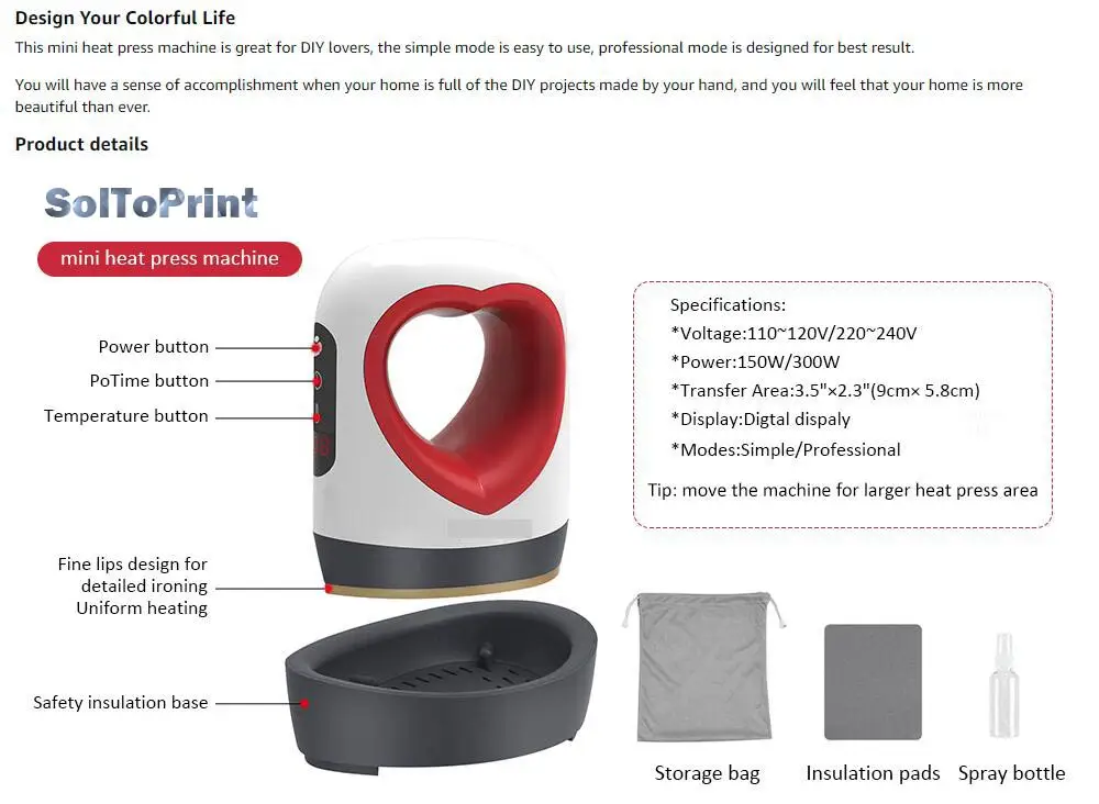 【Продуманный и широко используемый 】 маленький и удобный для переноски. Подходит для передачи фотографий или текста на футболках, одежде, сумках, Ковриках для мыши, головных уборах, обуви, мягких животных и т. д. Для безопасности, пожалуйста, подождите, пока он полностью остынет перед хранением. При нагревании до заданной температуры будет звуковой сигнал, И он автоматически отключится, если не начнет работу через 30 минут.