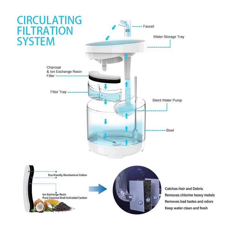 Фильтрованная вода-кошачий фонтан использует фильтр с активированным углем высокой плотности и высоким содержанием, который может эффективно поддерживать качество воды, увеличивать содержание кислорода.
