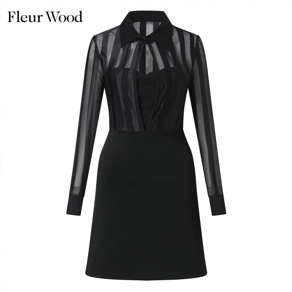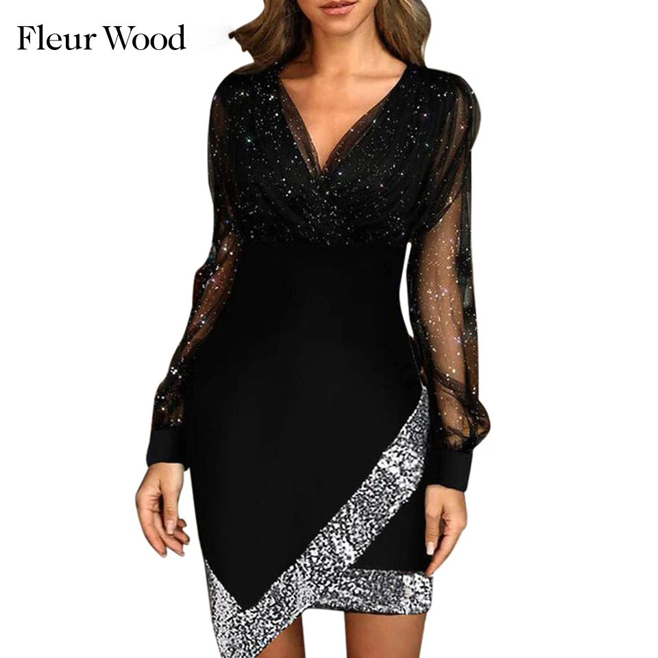 FLEUR древесины женское платье Тонкий блестками пикантные Лоскутные сетчатые платья с v-образным вырезом черного цвета в ретро-стиле; Элегантные вечерние Клубное платье с длинными рукавами с принтом Принцесса облегающее платье