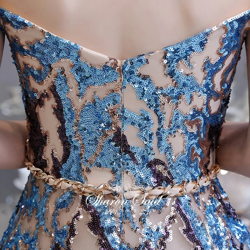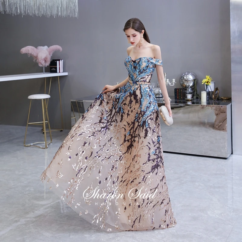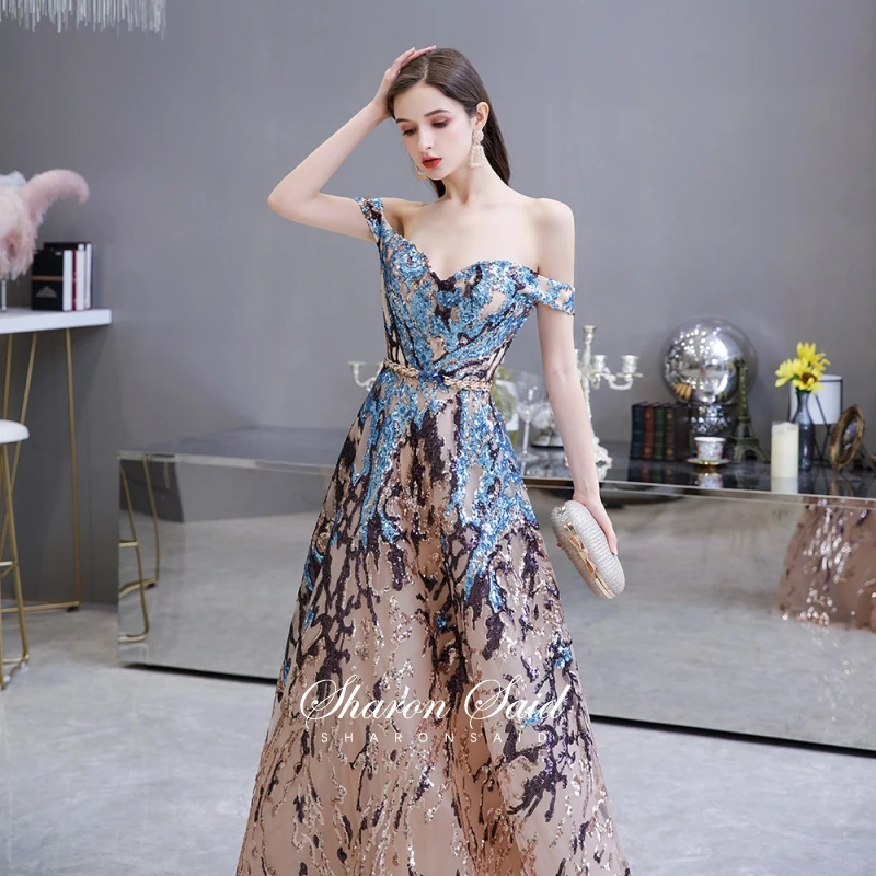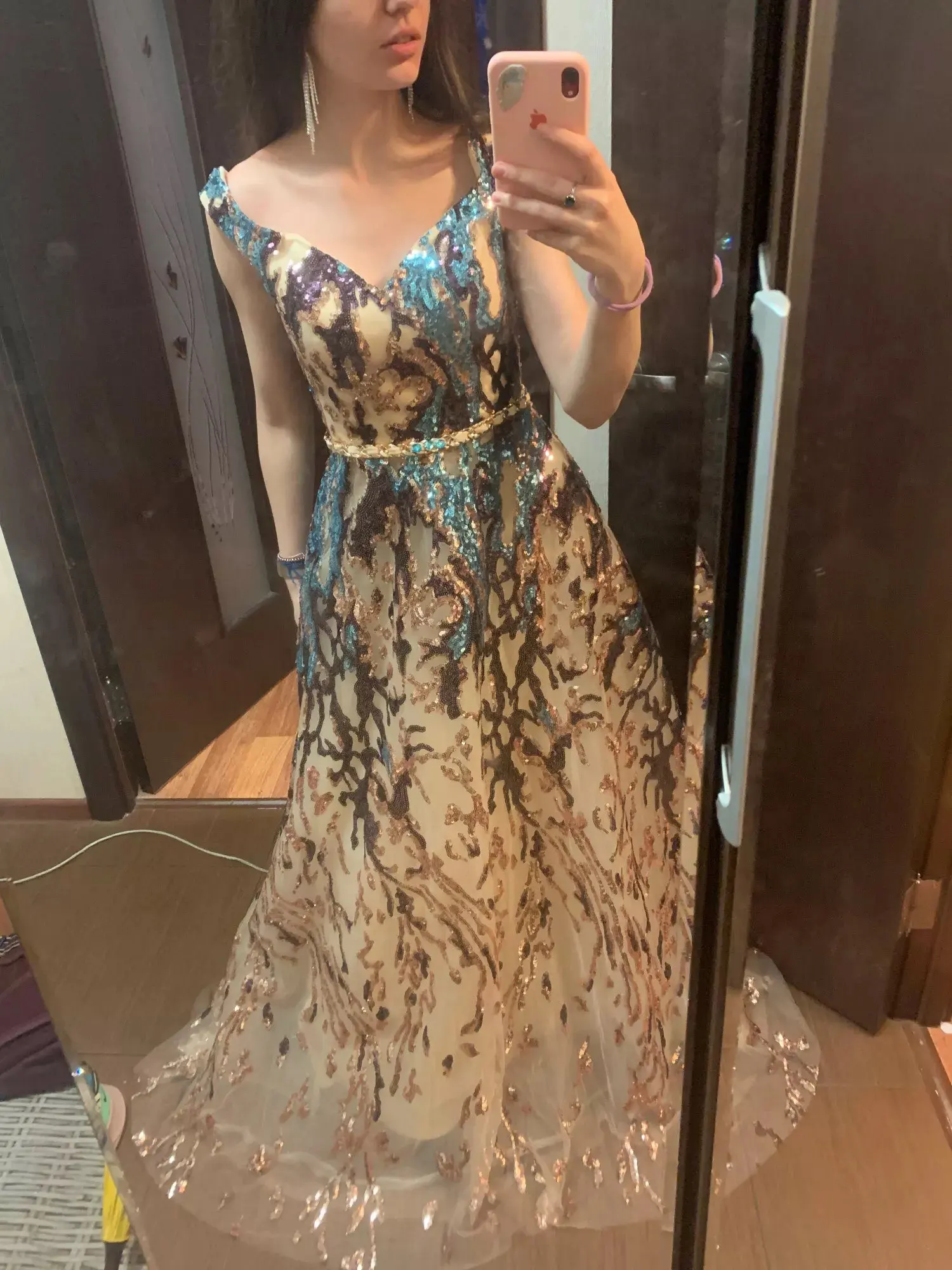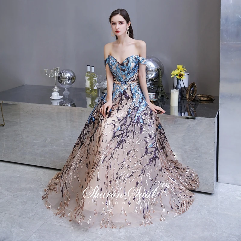 Блестящие Длинные вечерние платья с блестками, элегантное ТРАПЕЦИЕВИДНОЕ ПЛАТЬЕ цвета шампанского с открытыми плечами, официальное платье для гостей свадьбы и выпускного вечера SS264