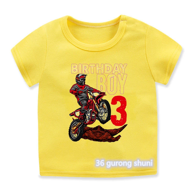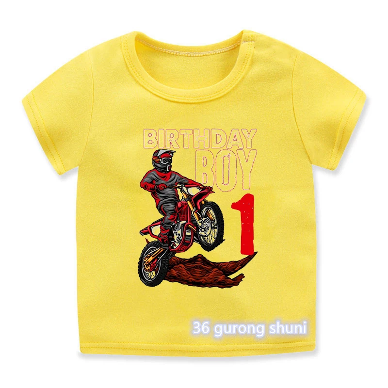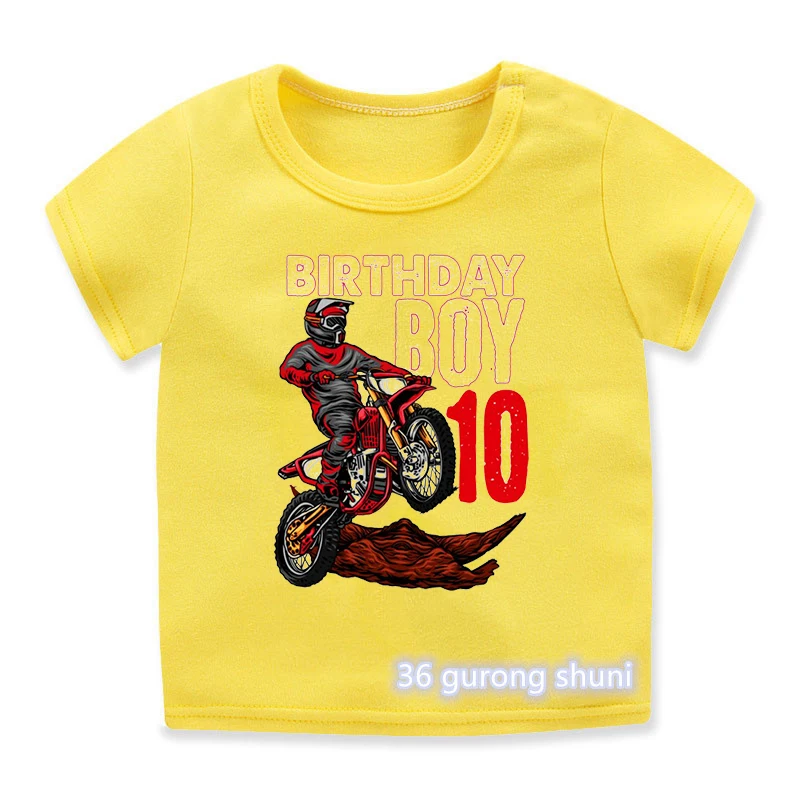 Футболка для мальчиков с забавным графическим принтом мотоцикла, одежда на 10-й день рождения, летняя футболка для малышей, модная желтая футболка для мальчиков, топы