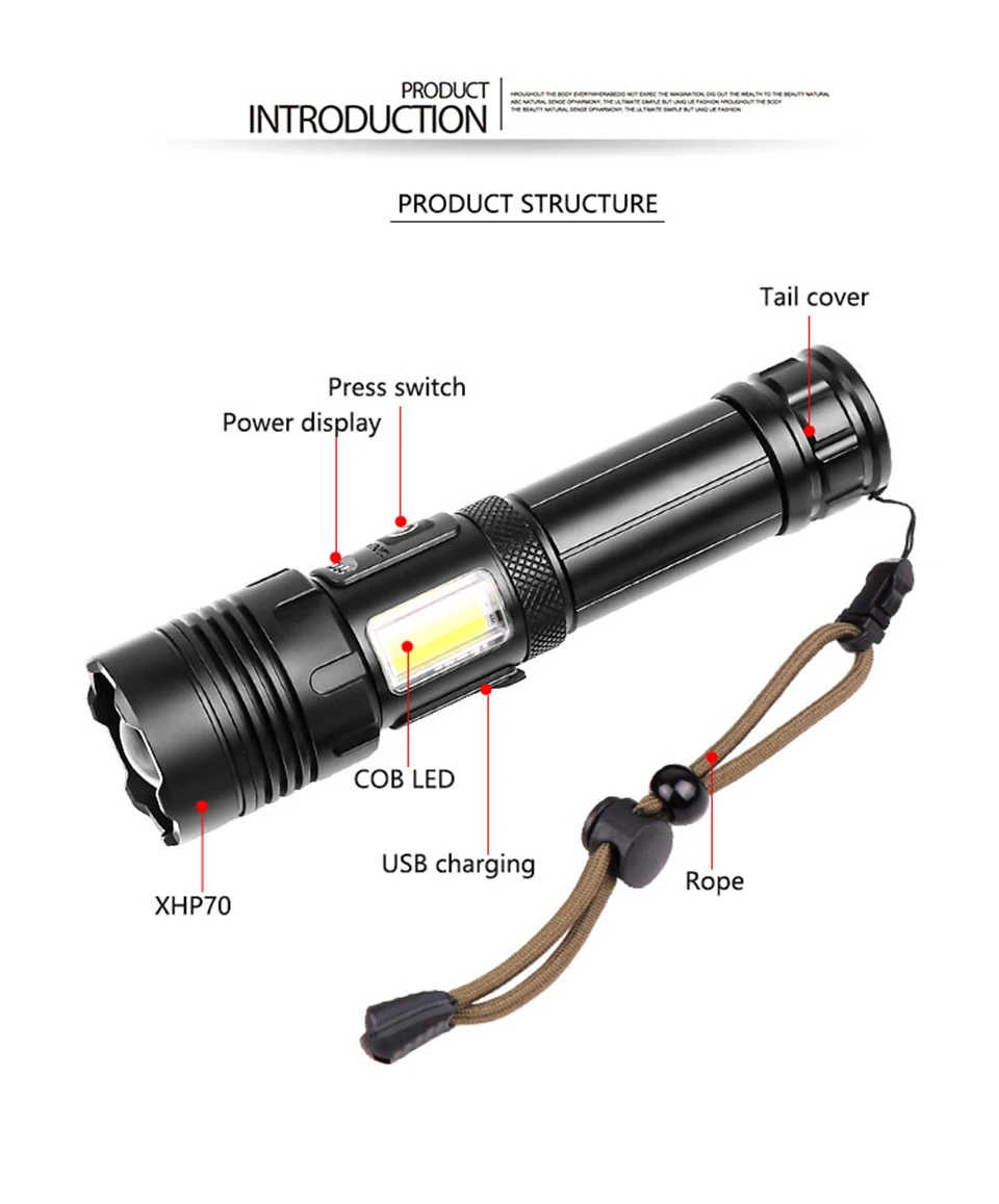 6. Срок службы лампы: 100000 часов7. Цвет Фонарика: черный8. Излучаемый Цвет: белый светильник9. Переключатель:Кнопочный переключатель 10. Чехол Материал: Прочный авиационный алюминий 11. Расстояние освещения: более 200 метров12: светодиодный срок службы: более 100000 часов