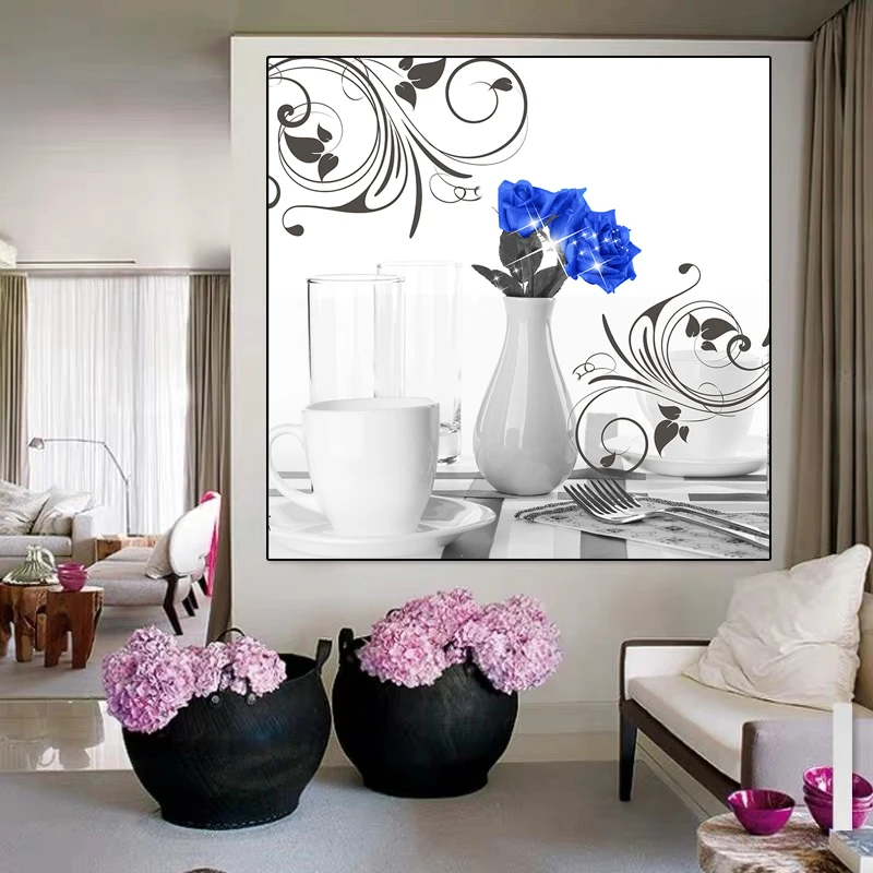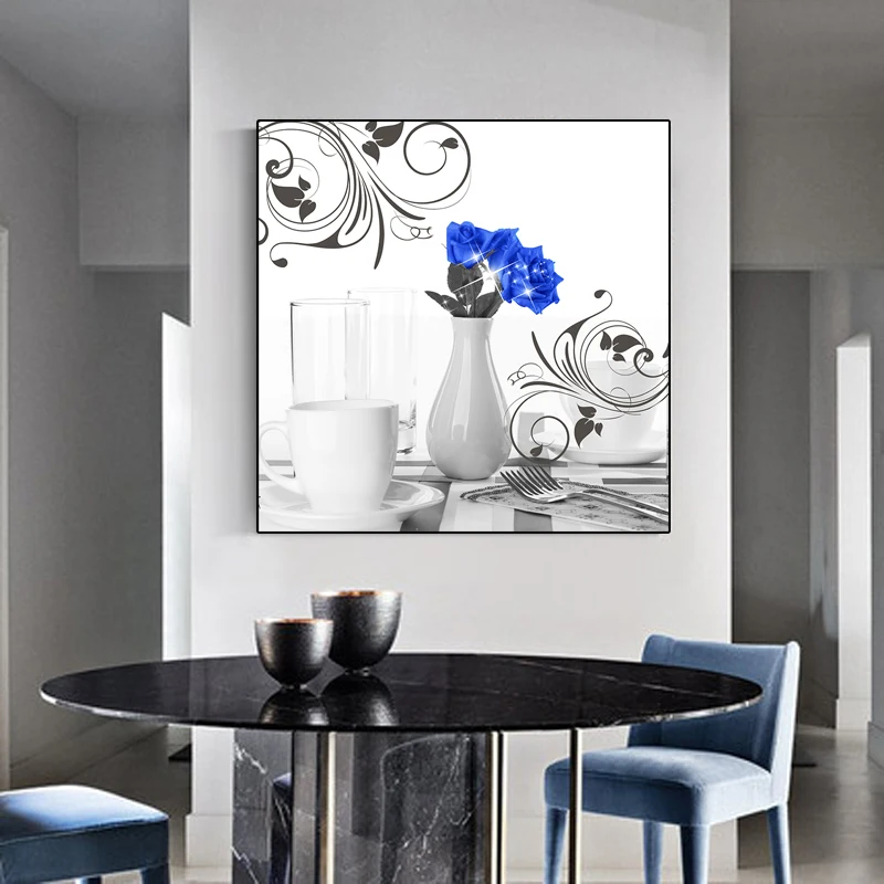 Современная Картина на холсте с синими розами, черно-белые художественные плакаты, принты, настенные картины, Скандинавская простота, украшение для гостиной и дома
