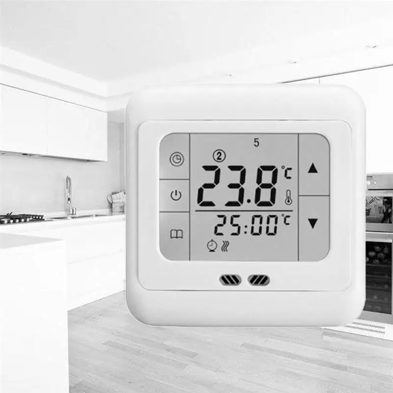 Этот нагревательный термостат с еженедельным программированием использует новейшее Однокристальное компьютерное управление Технология, с гибким поликарбонатом и крышкой из АБС-пластика. Обладает высокой надежностью и мощной защитой от помех. Применение электрического нагревательного оборудования или управления приводом. Особенности -Цвет: белый. -Материал: Поликарбонат и АБС-пластик. -Размер: 8,6x8,6x3,7 см (ДхШхВ). -Сенсорный экран, простота в эксплуатации и практичность. -Большой ЖК-дисплей с белой подсветкой. -Виды периодов временных режимов. 5 + 2 / 6 + 1 / 7 дней. -Установка ежедневных 6 периодов времени и настройки температуры. -Высокая надежность и мощная защита от помех. -Часы продолжаются, когда отключается питание, и это не повлияет на настройки времени. -Компактная распределительная коробка, подходящая для всего мира. Параметры -Источник питания: 220 В переменного тока, 50/60 гц. -Выходная мощность: 250 В переменного тока/25 А. -Максимальная мощность переключателя: 3600 Вт. -Максимальный номинал переключения 16 А. -Диапазон настройки внутреннего датчика: 5 - 35 °C (программируемый). -Диапазон измерения внутреннего датчика: 0 - 40 °C. -Тип дисплея: сенсорный ЖК-экран, размер области дисплея: 60x45 мм. -Внутренний датчик: NTC B = 3380 10k @ 25 градусов по Цельсию. -Блок Настройки: 0,5 °C/шаг. -Точность индикации: ± 0,1 °C. Упаковочный лист1 х Термостат 2 винта φ 4x25