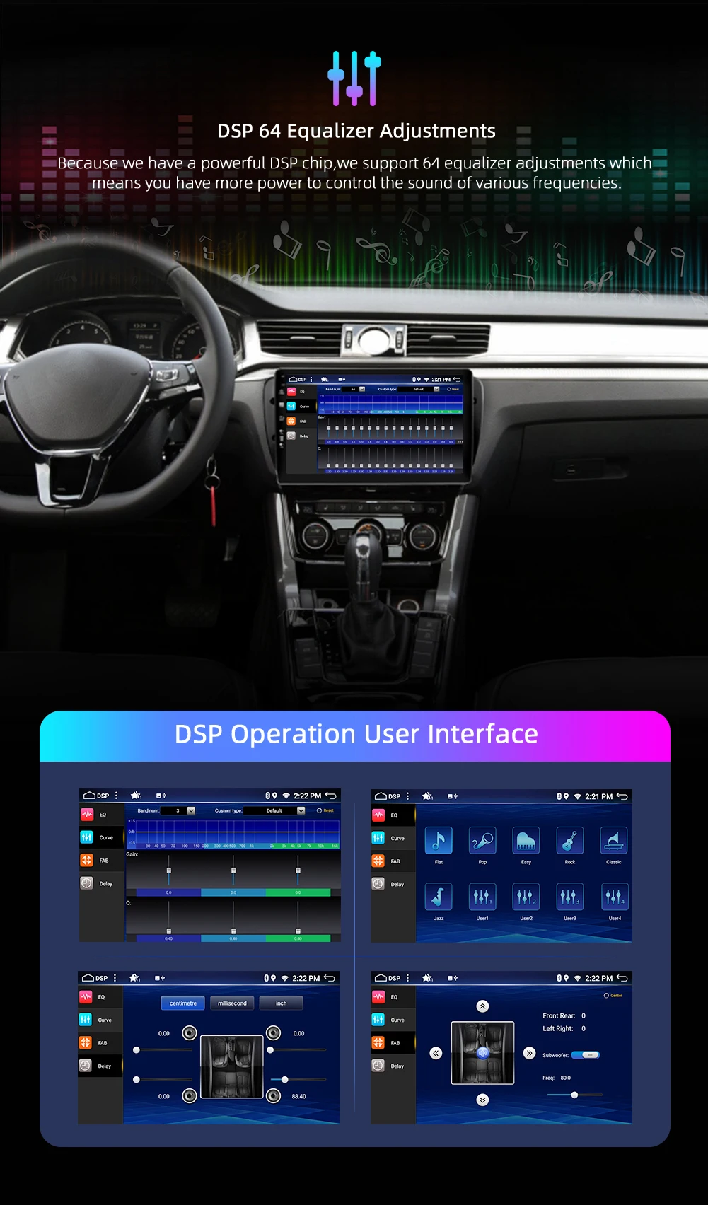 DSP + Carplay + сенсорный экран + радио + FM/AM + RDS + gps-навигация + карта + Wifi + Bluetooth + управление рулевым колесом + сплит-экран + USB + SD + AUX in/Out + зеркальная ссылка + камера заднего вида + сабвуфер + Play Sore + эквалайзер + набор обоев + логотип автомобиля + 3G/4G + TPMS + DAB + OBD 2 + DVR + TV