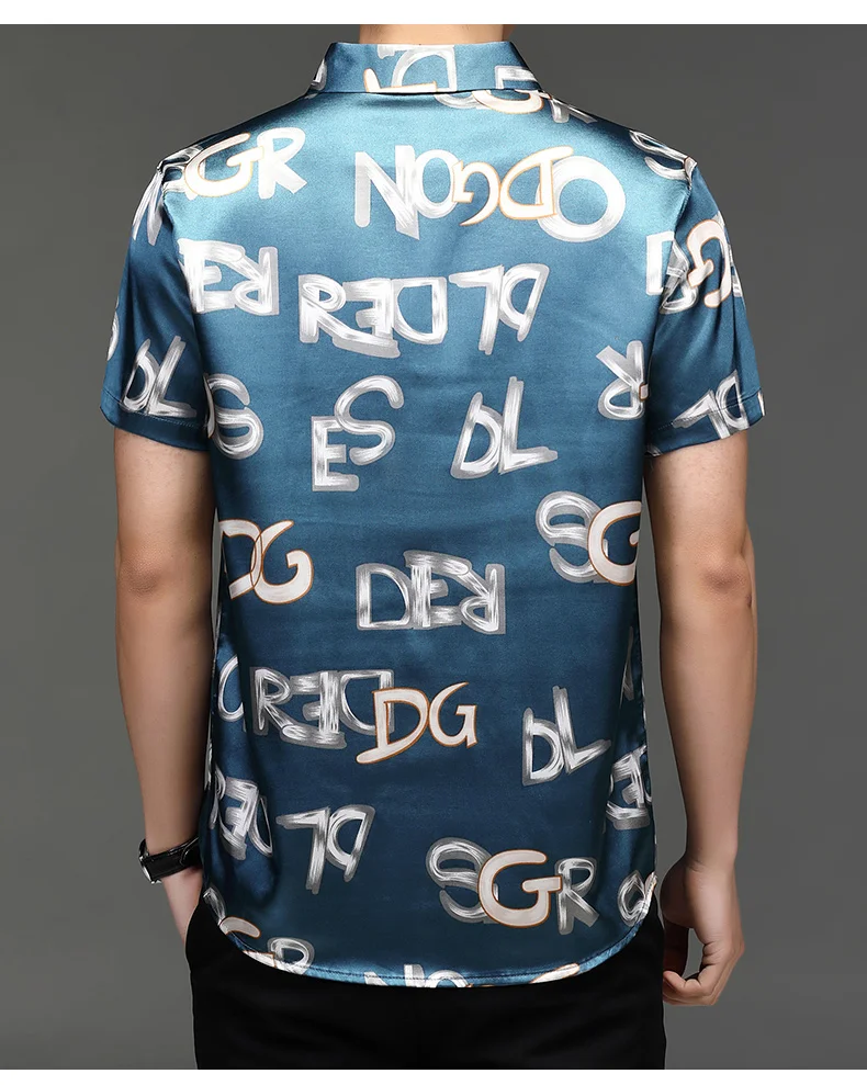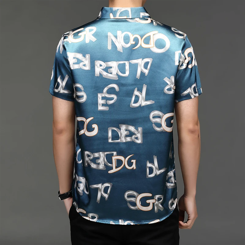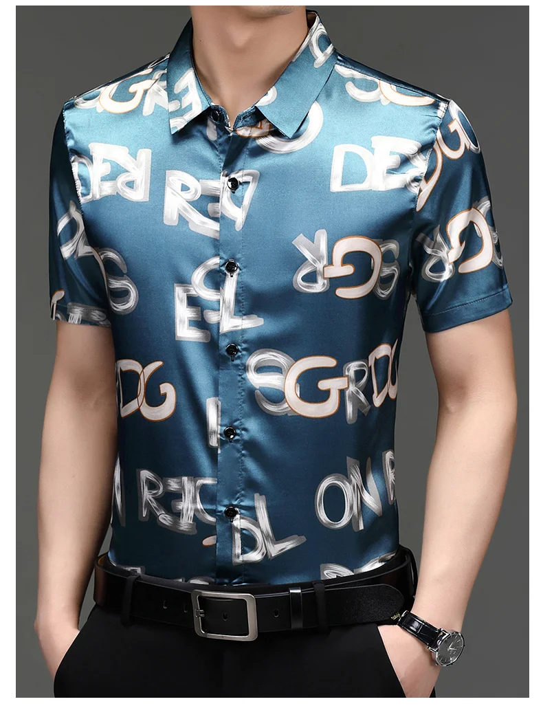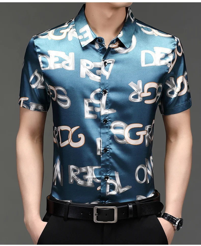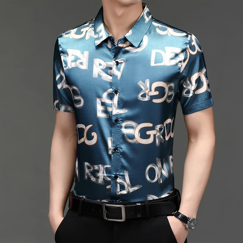 Рубашка мужская с буквенным принтом, модная повседневная сорочка из шелка и хлопка, приталенный силуэт, с короткими рукавами, C766, на лето
