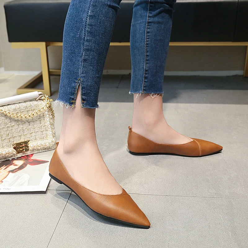 Женские туфли из мягкой искусственной кожи, черные балетки больших размеров 40, с острым носком, без застежки, лоферы для весны, 2022