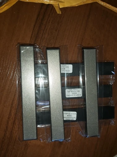 Алмазные пластины на гальванической связи обеспечивают интенсивное удаление металла и используется для режущую кромку со значительными повреждениями (сколы, изгибы и т. д.). Алмазная пластина F80-120 очень грубая используется для грубого шлифования кромки и формирования формы лезвия. Алмазная пластина F200-400 грубая используется для формирования режущей кромки. Алмазная пластина F500-600 Medium используется для основных операций заточки и создания агрессивного реза. Алмазная пластина F800-1000 Fine используется для предварительной обработки режущей кромки и удаления заметных следов. Алмазная пластина F1500-3000 очень тонкая используется для отделки режущей кромки. Они работают гораздо больше, чем камни на органической или металлической связи с тем же размером зерна. Это достигается путем торчащих алмазных зерен, в то время как органические или металлические соединения всасываются в связующее вещество и смешиваются с ним. Концентрация зерна в слое составляет 100%. Хотя следует отметить, что эти камни будут уступать другим камням во время работы из-за тонкого покрытия, которое будет активно удаляться при заточке. Также следует помнить, что при работе с мягкими сталями (до 58 HRC) эти алмазные камни получатся быстрее, чем при работе с более твердыми сталями. Алмазные камни на гальванической связи не требуют подготовки к работе (выравнивание, «подбадривание» и т. Д.). Абразивные Размеры: 4х20х150 мм