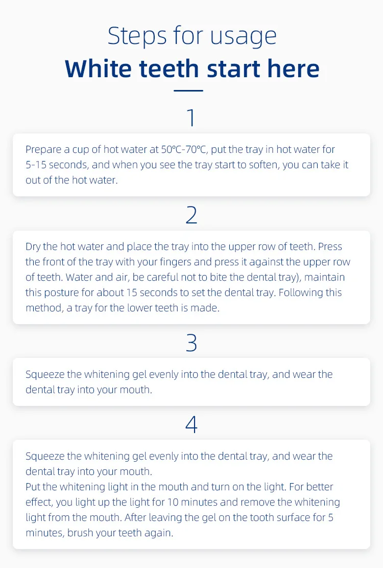 Примечание (очень важно!):Для защиты батареи во время транспортировки, у нас есть белый пластиковый диск в середине двух батарей для изоляции.Перед использованием, пожалуйста, не забудьте открыть крышку мини-холодный отбеливающий светильник и вынуть белый пластиковый диск. Добро пожаловать дропшиппинг!Пожалуйста, не беспокойтесь, мы не будем отправлять счета/цены или любые другие акции,Мы отправим товар как можно скорее, желаем вам хорошего дня!-Если вам нравится этот товар, пожалуйста, добавьте его в «список желаний»,-Если вам нравится наш магазин, пожалуйста, добавьте его в «Список магазинов».-Большое спасибо! (* ^ *) ОписаниеШаг 1: сделать себе заполненные лотки.Нагрейте лоток под 80 ℃ горячей водой и Нагрейте его около 10 секунд. Положите лоток для рта на зубы, аккуратно Используйте пальцы, пока не приклейте зубы, плотно прижмите лотки к зубам. Шаг 2: Сравните зубцы с используемыми зубцами. Шаг 3: нанесите тонким слоем отбеливающий гель для лотки для губ и равномерно распределите (0,25 до 0,4 мл для каждого лотка больше всего впустую). Шаг 4: вставьте лотки для рта в рот и над зубами, плотно прижмите лотки к зубам. Шаг 5: вставьте поднос в течение 10 минут или 7 минут, затем добавьте краску в воду. Шаг 6: После отбеливания зубов используйте спрей для рта. Это сделает вас свежим дыханием. Повторите это полное лечение 2 зубцами убедитесь, что вы сушите в краску и поднос между сессией, или один раз в день, через 3 дня, сравните до и после с направляющей для затенения зубов, мы можем выглядеть лучше 7-10 теней. 10 шт. в комплекте:10 * гель для отбеливания зубов (3 мл)2 * последний дизайн термоформы одиночные арки лотки1 * мини холодный светильник, отбеливающая лампа (в комплекте батареи)1 * Профессиональная 3D направляющая для затенения зубов Efero отбеливающая ручка для зубов, очищающая сыворотка, удаляет пятна от налета, зубные инструменты, отбеливать зубы, гигиена полости рта, карандаш для отбеливания зубов, 1 шт. Как использовать отбеливатель для зубов:После чистки зубов снимите крышку и поверните кончик отбеливающего пера, пока эссенция не перенесется на головку кисти. Затем нанесите изделие на зубы равномерно и нанесите на краску чистой водой через 15-20 минут, мы рекомендуем использовать 2-3 раза в неделю.
