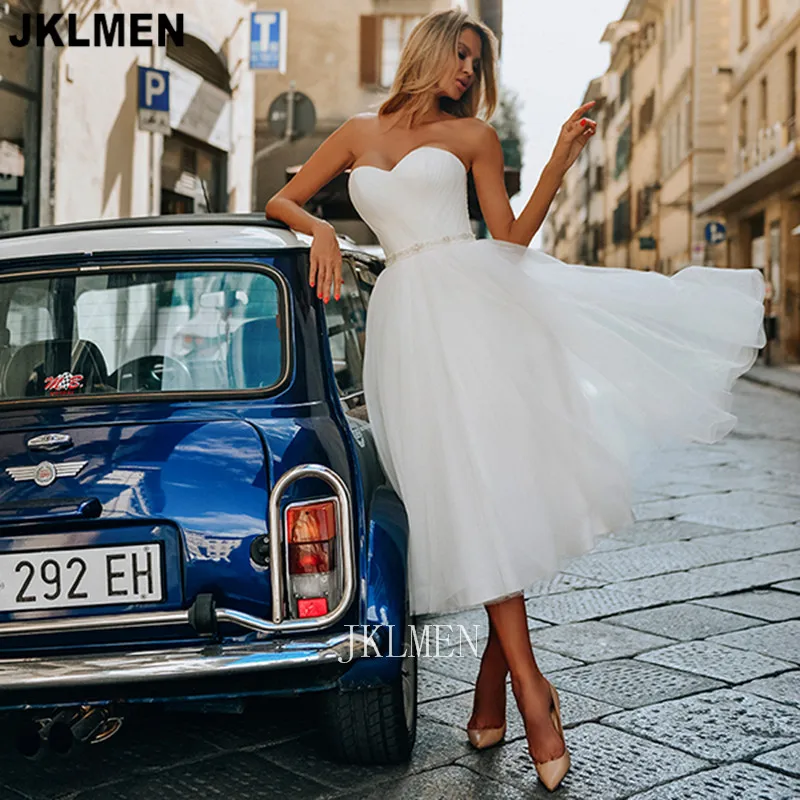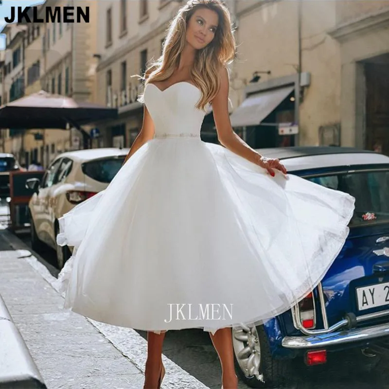 Женское Короткое свадебное платье, простое ТРАПЕЦИЕВИДНОЕ ПЛАТЬЕ до середины икры, с поясом и бусинами, 2021