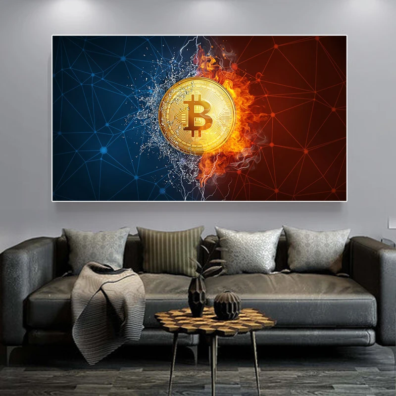 Картина на холсте горящий Биткоин, креативные постеры и принты с водой, настенные картины в скандинавском стиле, украшение для гостиной и дома