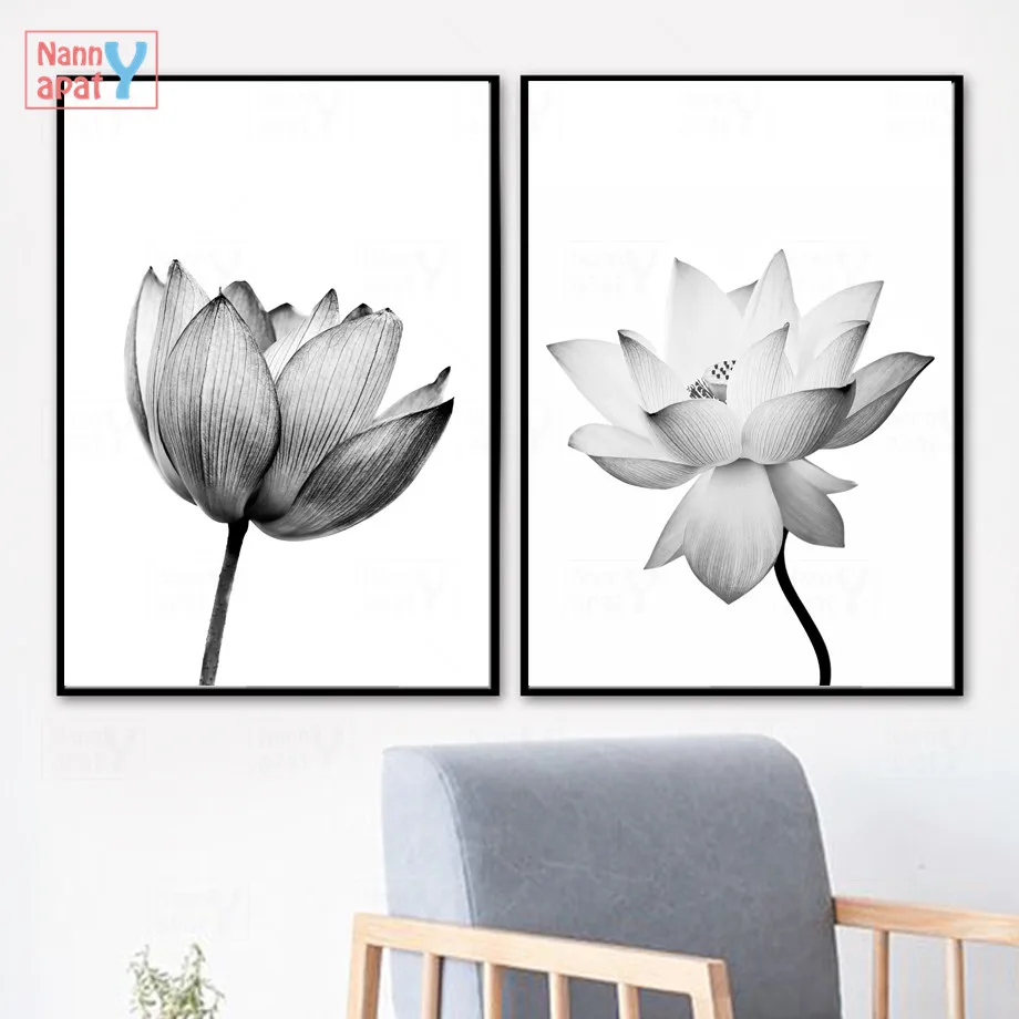 Настенная Картина на холсте с изображением цветов и бутонов, постеры и принты с натуральным лотосом, скандинавские черные и белые настенные картины для гостиной, домашний декор