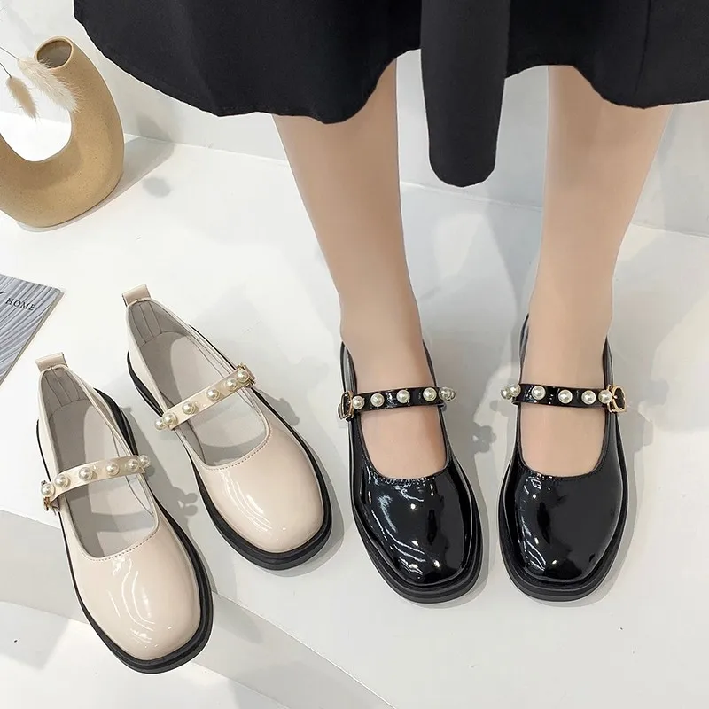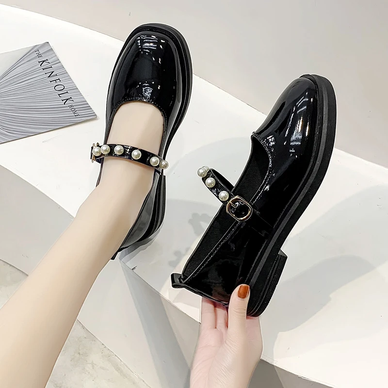 Женские туфли в стиле Мэри Джейн; Туфли на низком каблуке с жемчугом туфли в стиле Принцесса для девочек, Лакированная кожа в стиле "Лолита" шнурок для обуви туфли без каблуков с бисером туфли оксфорды 9091L