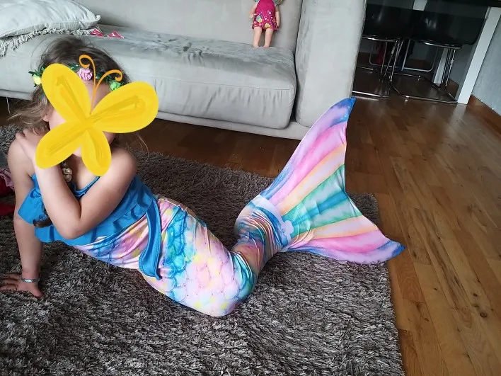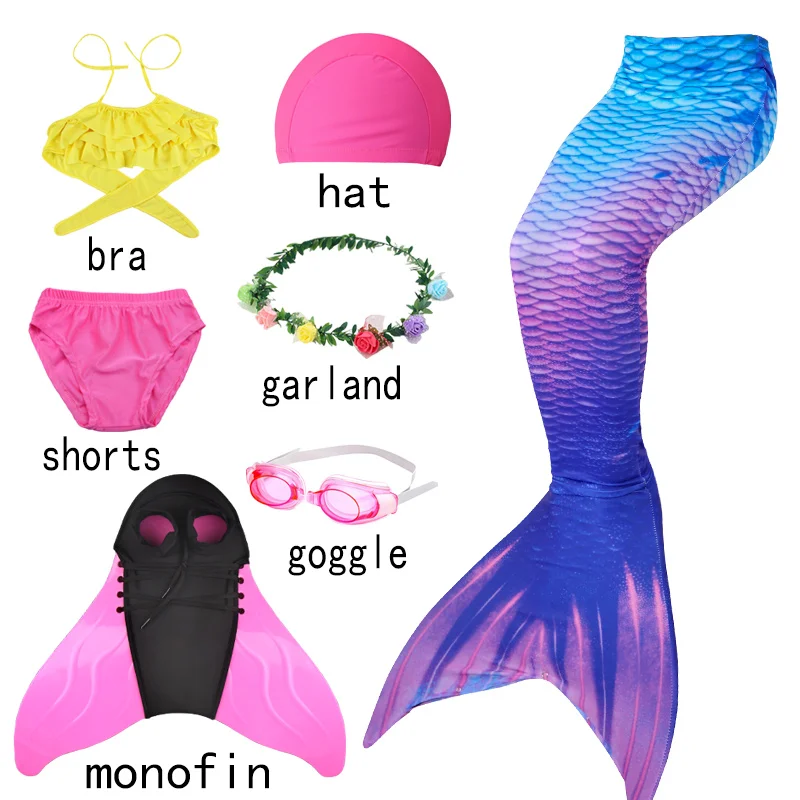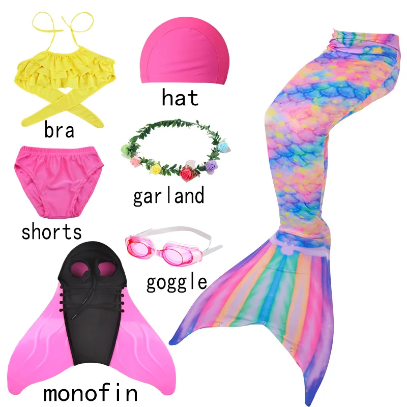Комплектация 7 шт.:1 * хвост русалки + 1 * моноласт + 1 * бюстгальтер + 1 * шорты + 1 * шляпа + 1 * очки + 1 * гирлянда
