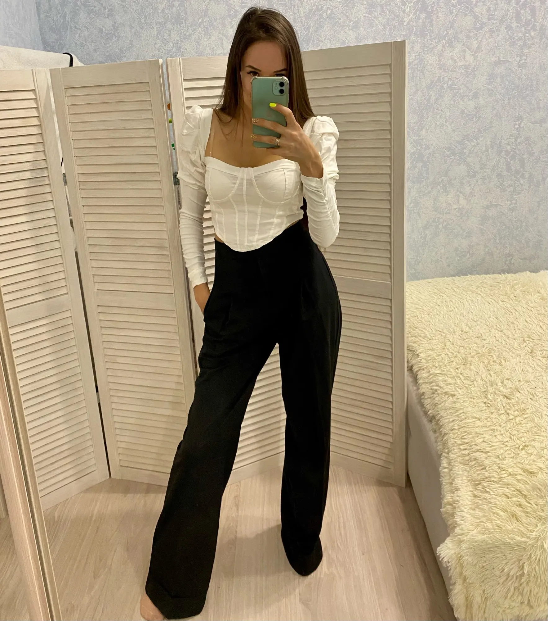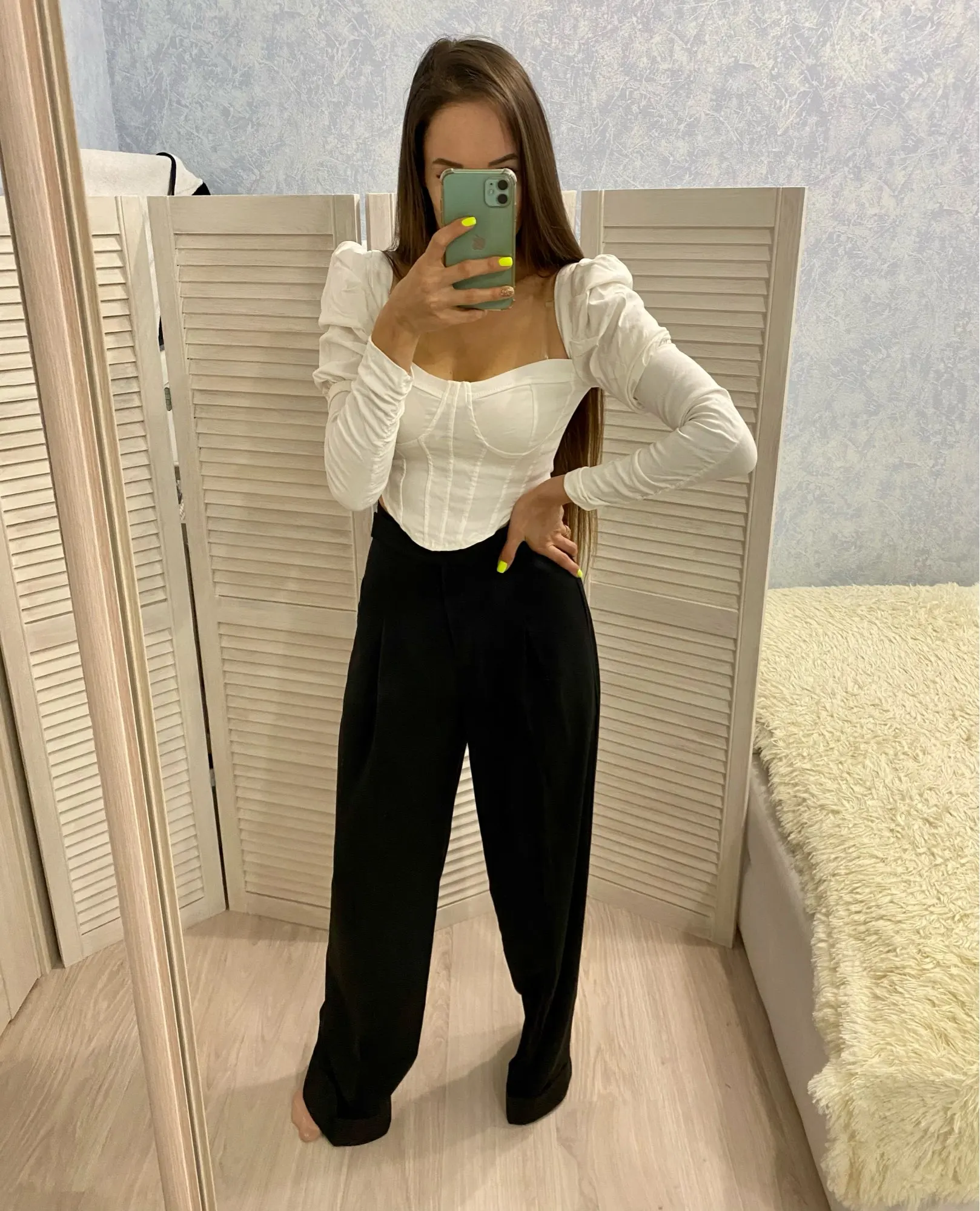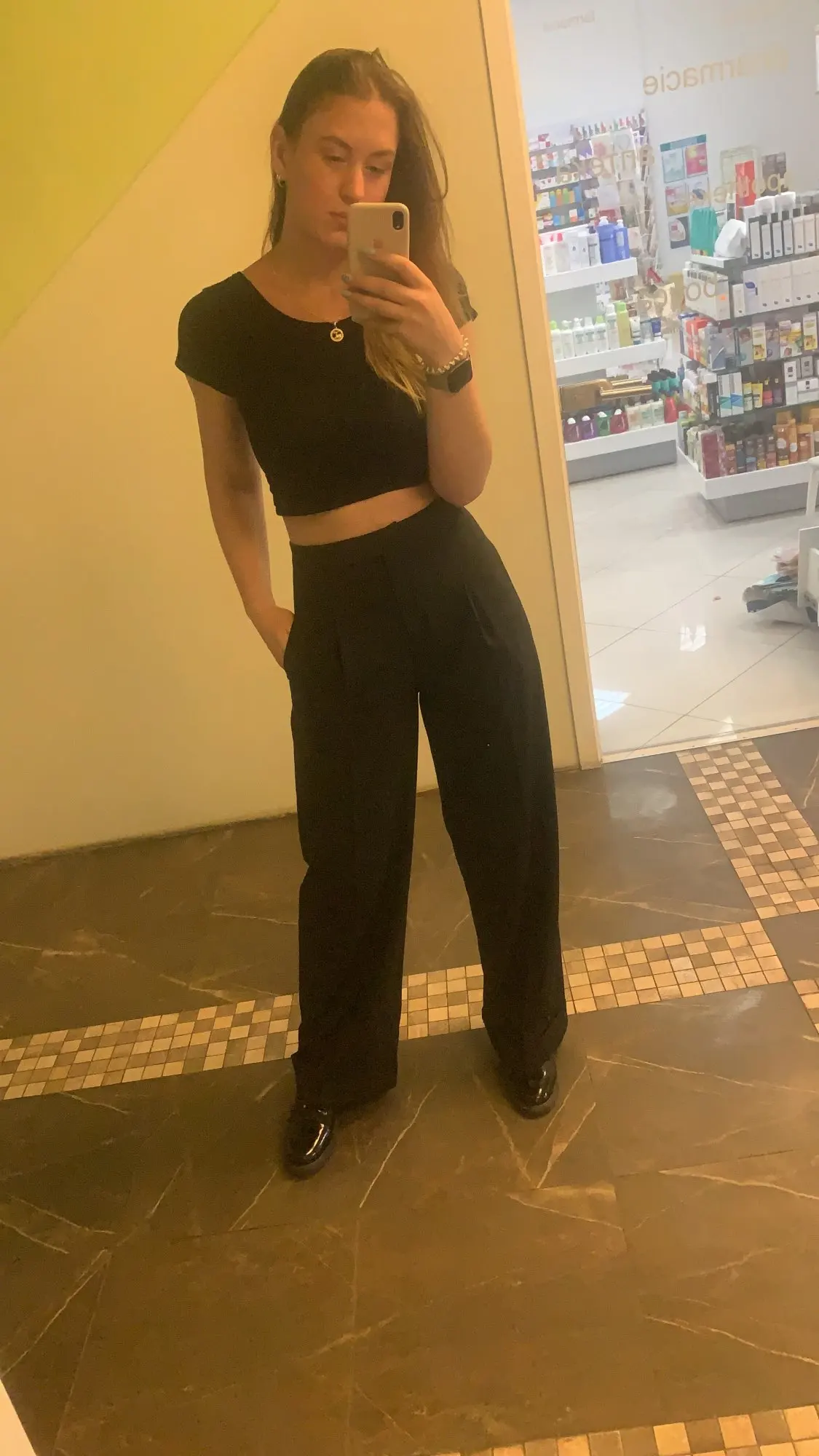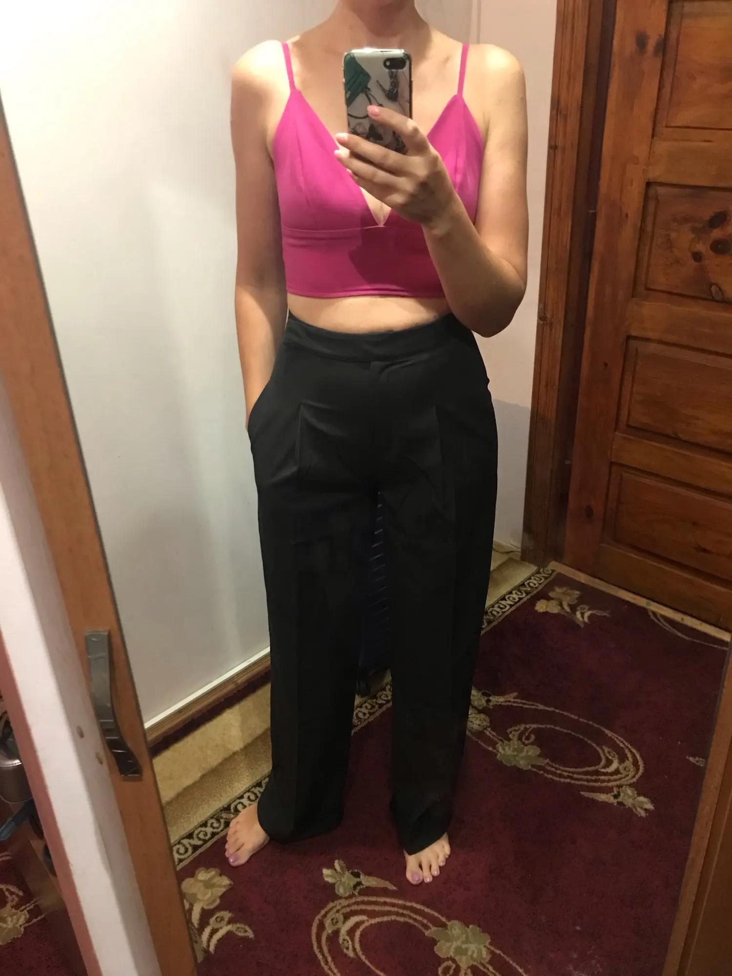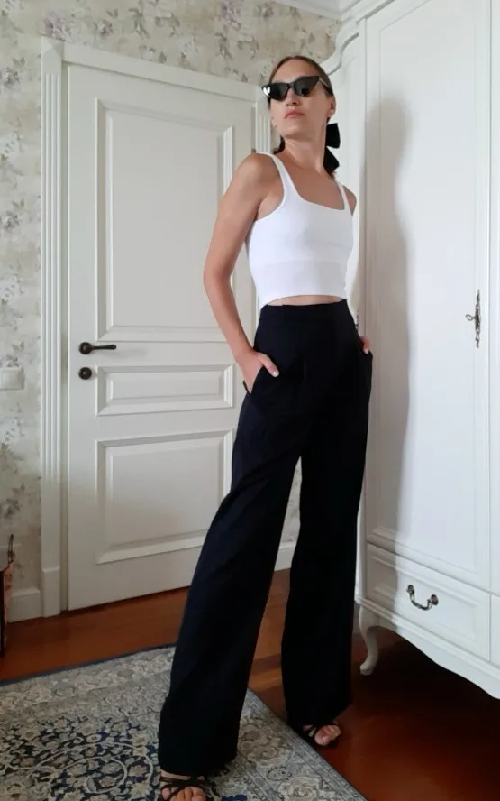Наконец-то после долгих поисков я нашла идеальные брюки чёрного цвета на высоких девушек. На свои параметры ОТ- 63 см ОБ- 83 см, рост 167 см выбрала размер S. Брюки сели отлично, в талии не жмут и в бёдрах не перетягивают и не жмут. На мой рост длина идеальная, с каблуками даже не будут короткими. Брюки на девушек с высоким ростом!!! Брючки хоть и из тоненького материала, но не просвечивают и не электризуются, книзу слегка расклешенные. А спереди посередине просрочены будто имитация стрелок. Их можно сочетать сочетать с рубашками, свободными футболками, майками и в любом образе будут смотреться выигрышно! качество пошива отличное, швы все ровные, без перекосов и зазоров, торчащих ниток не было. Покупкой очень довольназа свою не высокую стоимость идеальное приобретение#алиэкспресс #aliexpress