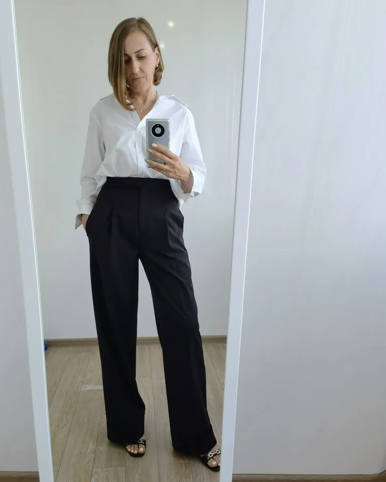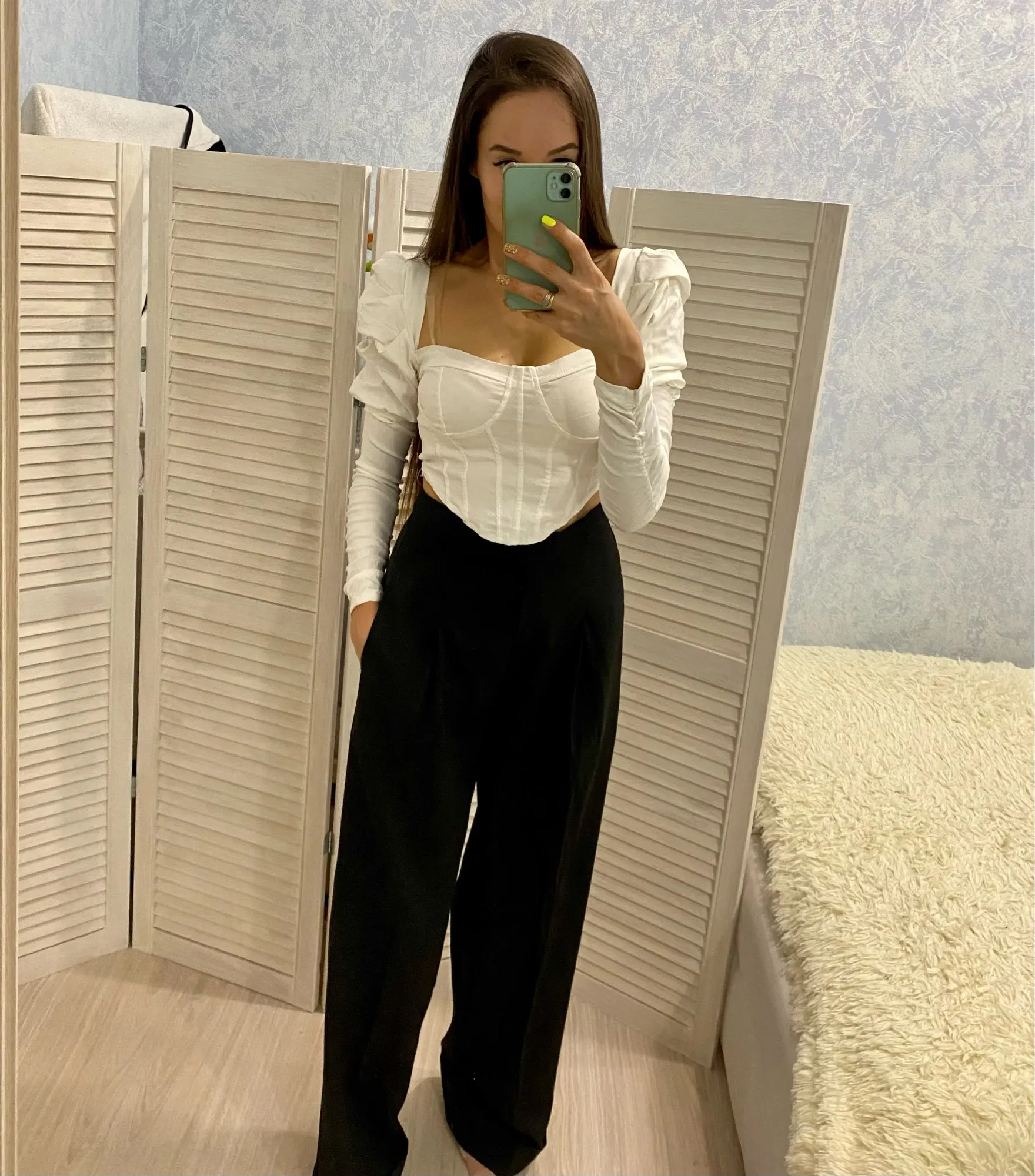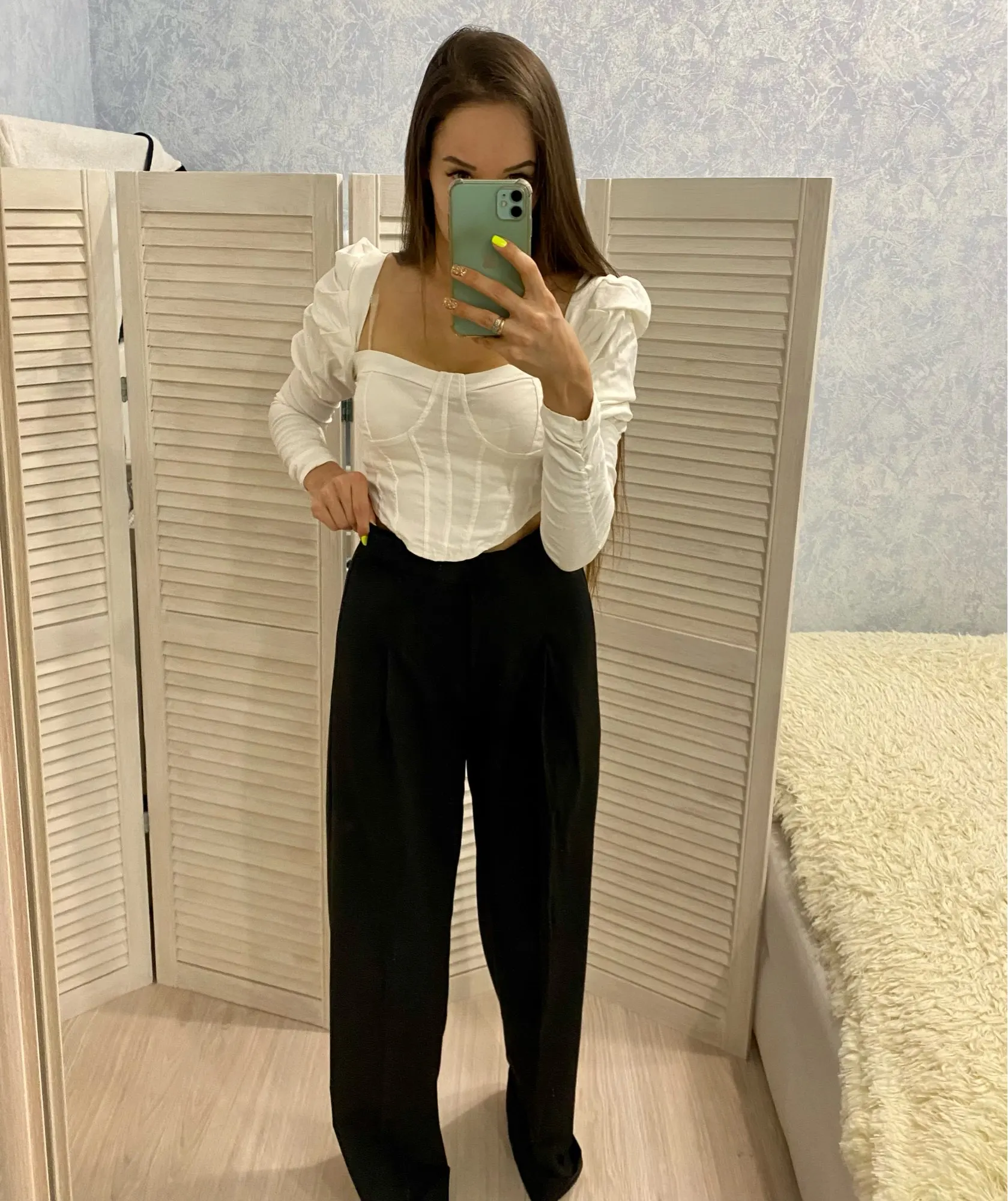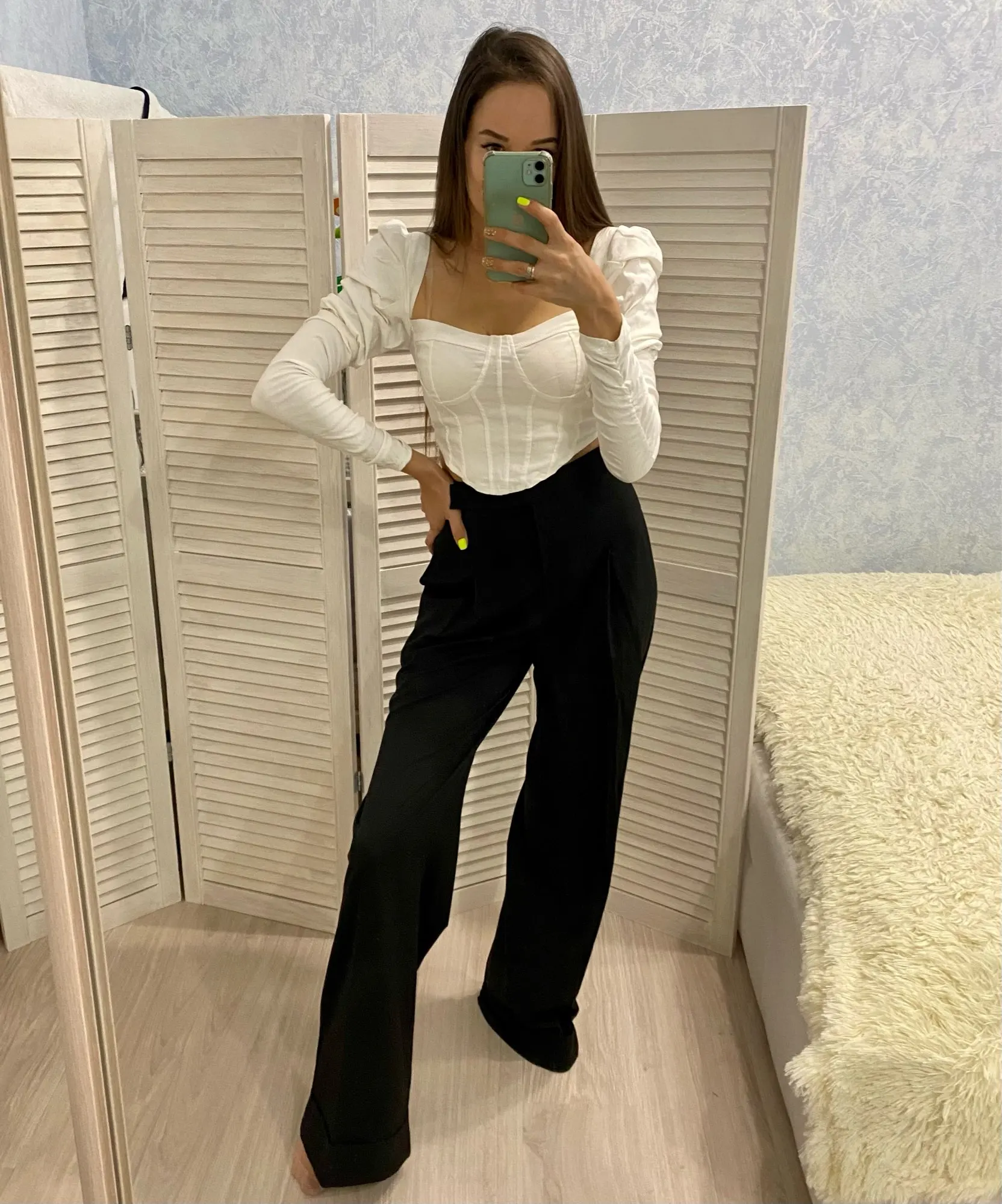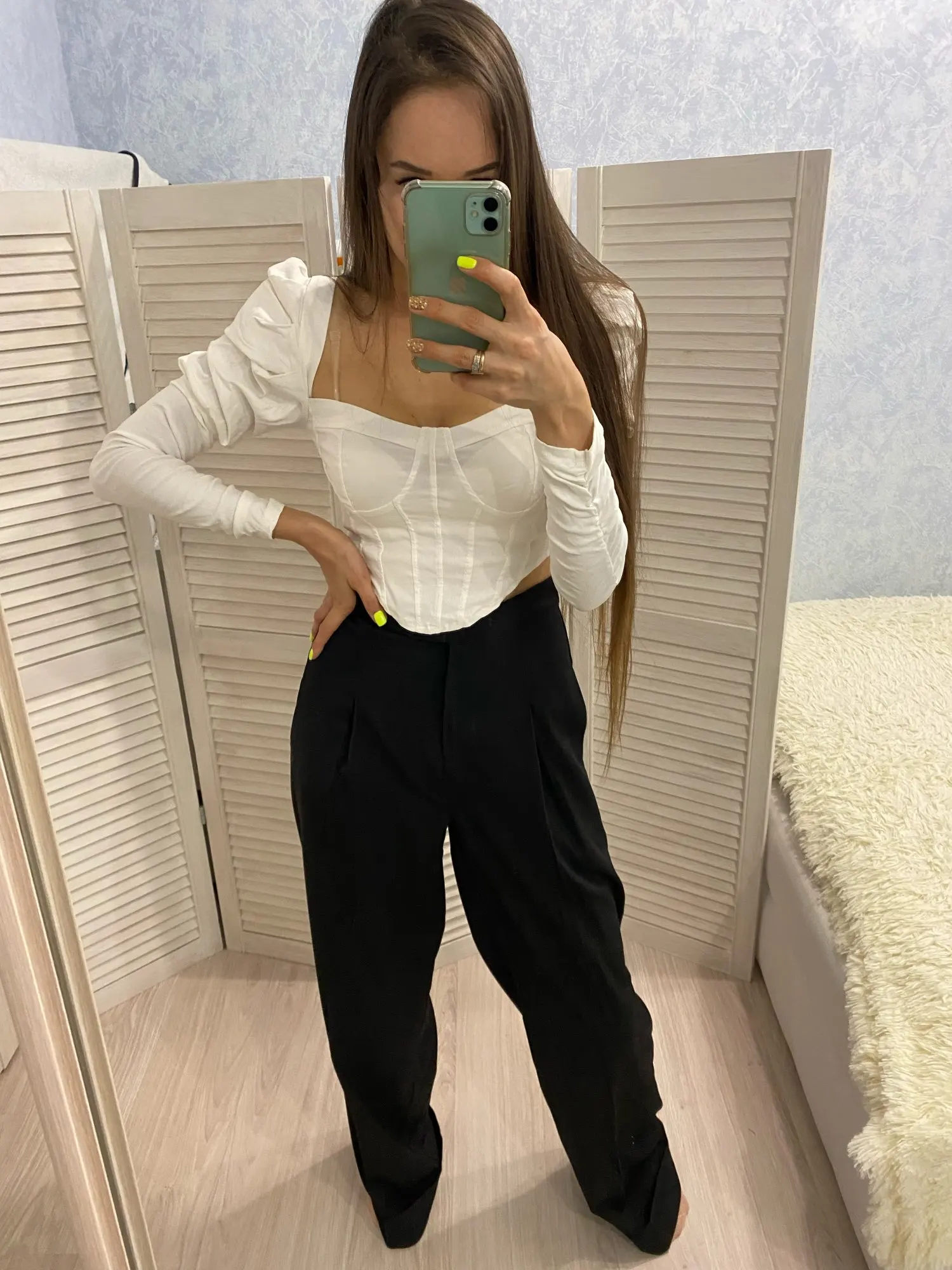 Наконец-то после долгих поисков я нашла идеальные брюки чёрного цвета на высоких девушек. На свои параметры ОТ- 63 см ОБ- 83 см, рост 167 см выбрала размер S. Брюки сели отлично, в талии не жмут и в бёдрах не перетягивают и не жмут. На мой рост длина идеальная, с каблуками даже не будут короткими. Брюки на девушек с высоким ростом!!! Брючки хоть и из тоненького материала, но не просвечивают и не электризуются, книзу слегка расклешенные. А спереди посередине просрочены будто имитация стрелок. Их можно сочетать сочетать с рубашками, свободными футболками, майками и в любом образе будут смотреться выигрышно! качество пошива отличное, швы все ровные, без перекосов и зазоров, торчащих ниток не было. Покупкой очень довольназа свою не высокую стоимость идеальное приобретение#алиэкспресс #aliexpress