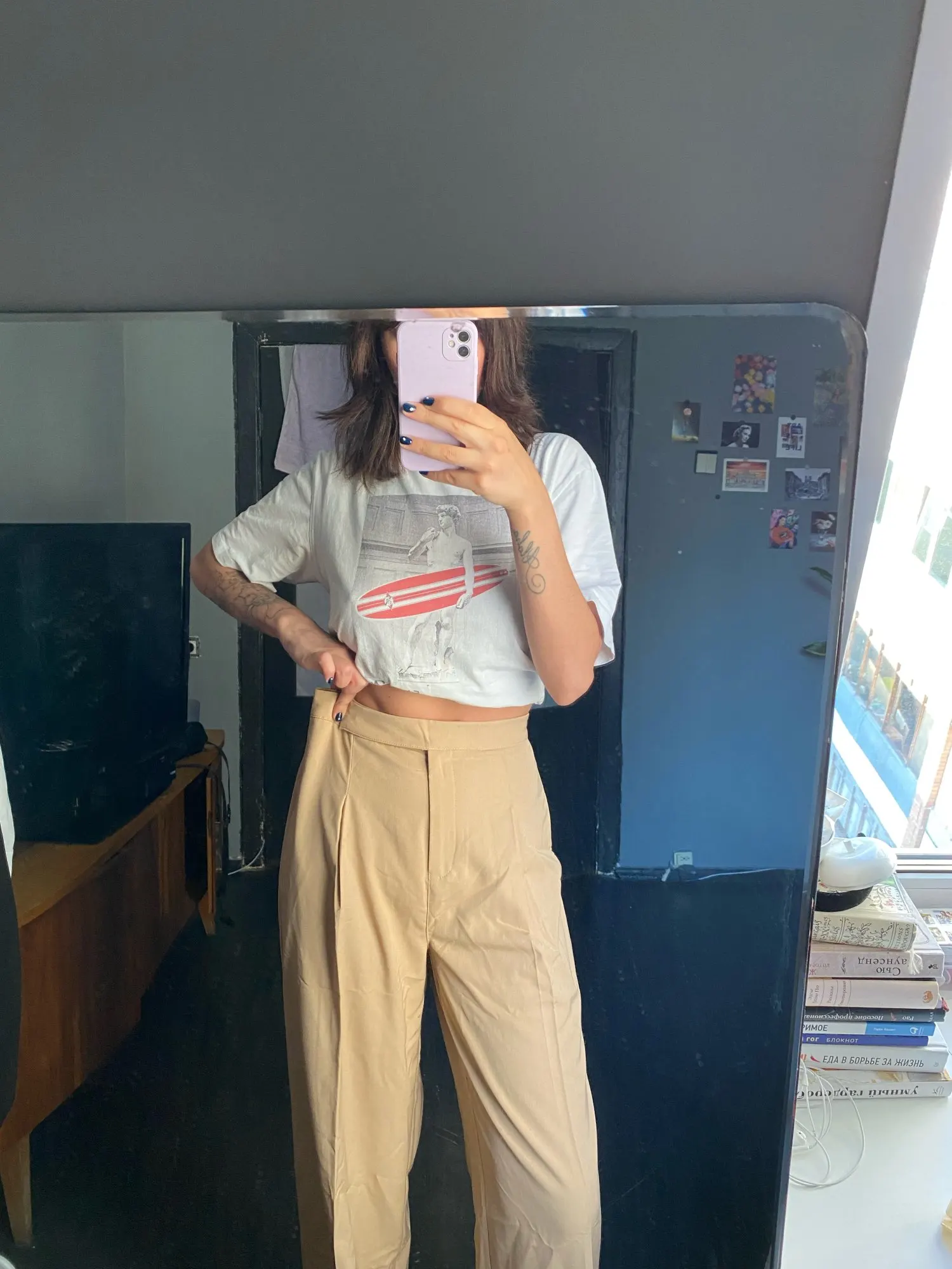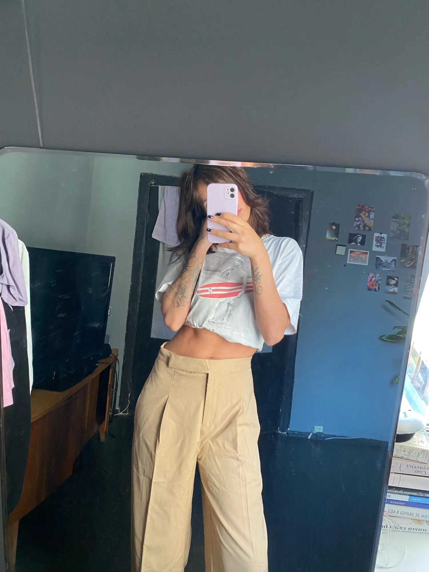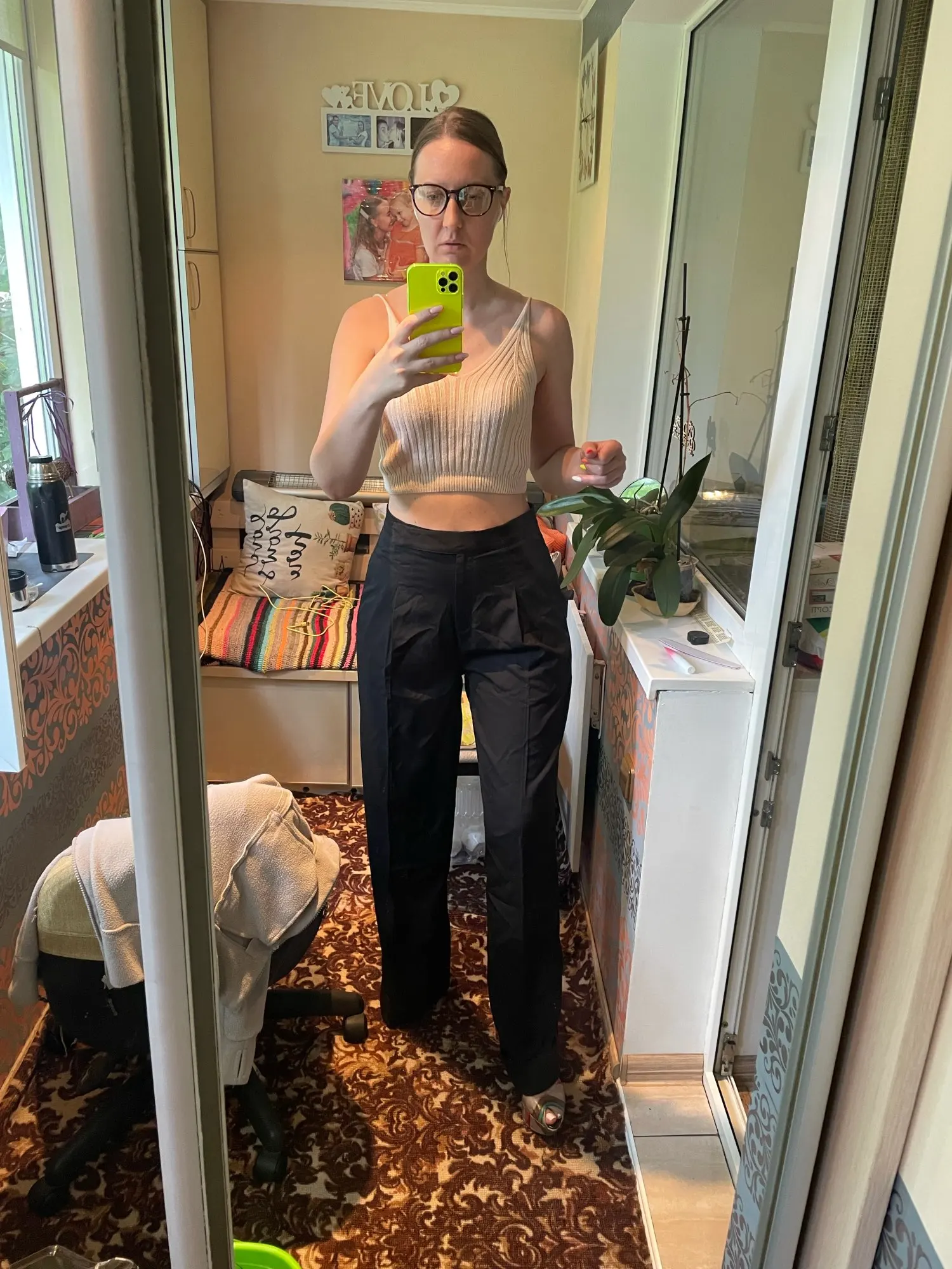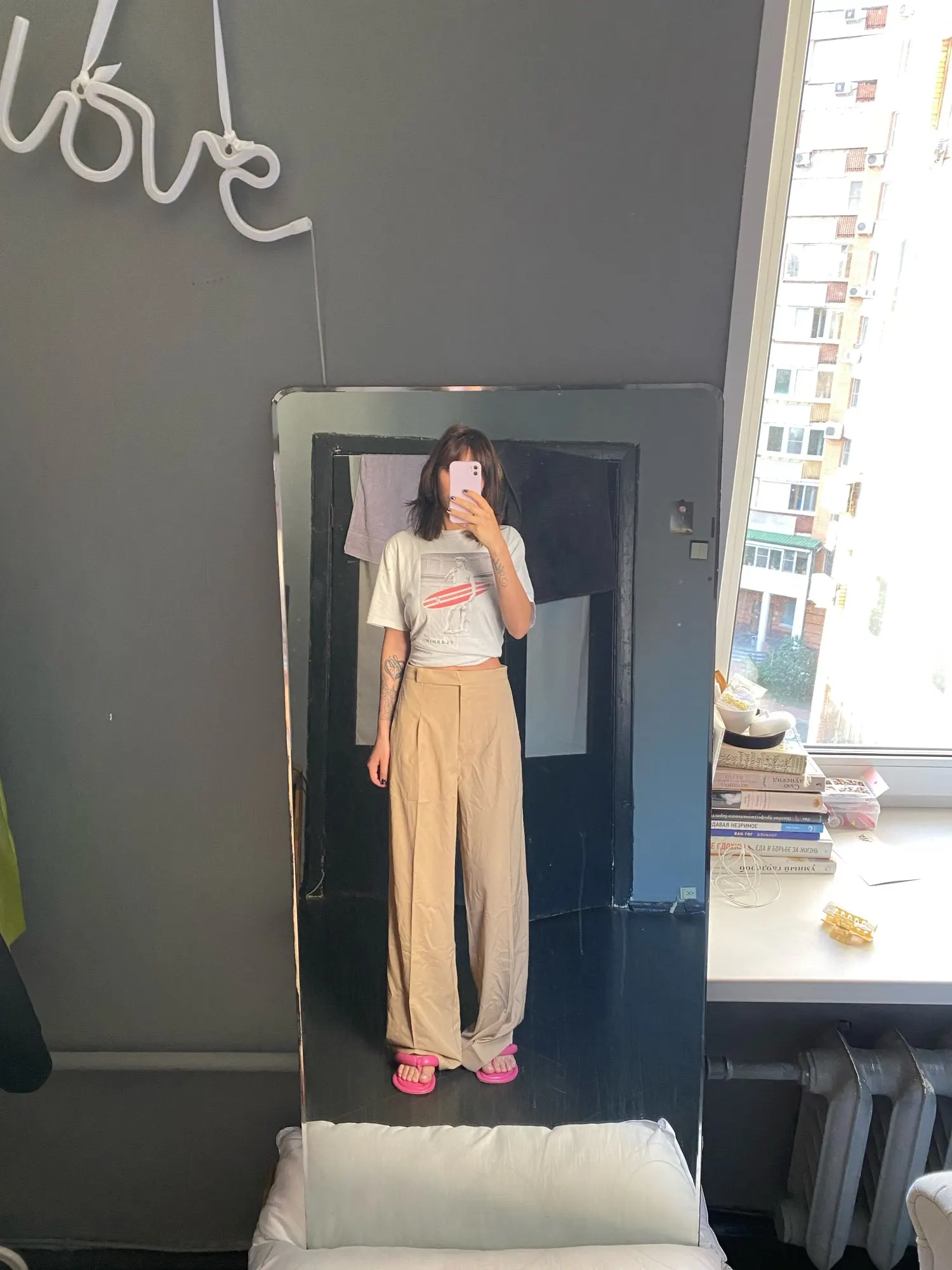 Бомбезные брюки! Круто смотрятся с сандалиями и ботинками Аля Мартинс. Ткань дорогая, тонкая, очень приятная к телу. В составе будто вискоза. Крой и качество исполнения изумительные! На рост 172 и талия 68, бёдра 92 взяла М, сидит немного свободно. Лучше бы сел S, тогда бы смотрелось ещё круче. Спасибо большое @solnceva.liza за обзор на них!