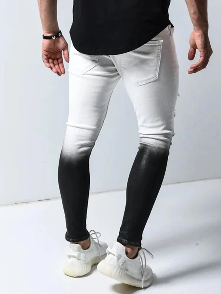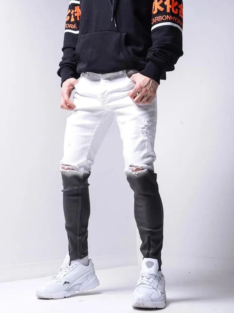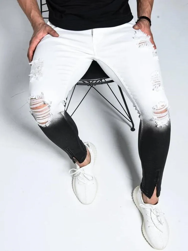 Модные мужские рваные джинсы с градиентом цвета, мужские повседневные облегающие мужские узкие джинсы s, байкерские джинсы-карандаш в стиле хип-хоп на молнии