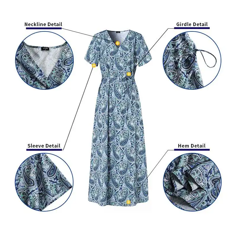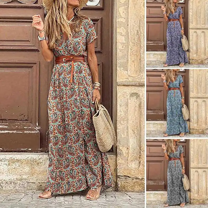 Сарафан женский пляжный с коротким рукавом, вечерний сарафан с V-образным вырезом и цветочным принтом, повседневная одежда, лето 2021