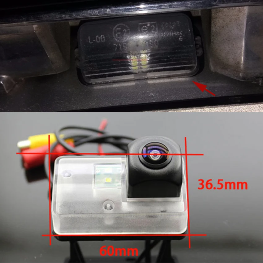 Перед заказом, пожалуйста, убедитесь, что фото размера камеры одинаковое, расположение лампы номерного знака и желтый разъем RCA, чтобы проверить размер камеры вместе, чтобы избежать ошибок. (Если вы не уверены, пожалуйста, оставьте сообщение для сотрудников службы поддержки клиентов: Отправьте модель автомобиля и год + информацию о фото позиции лампы номерного знака)