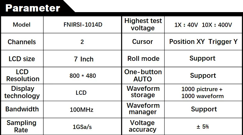 Характеристики:1: ширина аналогового ремешка: 100 МГц * 22: Количество каналов: 2 канала3: Максимальная частота дискретизации в реальном времени: 1GSa/s4: вертикальная чувствительность: 50 мВ/див ~ 500 В/Див5: Горизонтальный диапазон времени: 50S/div ~ 10NS/div6: Максимальное испытательное напряжение: 40 В (1X зонд), 400 В (10X зонд)7: Глубина хранения: 240 кбит8: Входное сопротивление: 1MΩ9:ADC точность: 8 бит10: Режим соединения: AC/DC11: режим запуска: одиночный, нормальный, автоматический12: кромка триггера: подъемная кромка/опускающаяся кромка13: внешнее триггерное напряжение 0 - 40 в14: Дисплей: 7 дюймов-800*48016: удлинительные порты: экспорт изображений USB18: Размер: 340 мм x 140 мм x 70 мм19: тела Вес: 1,5 кг