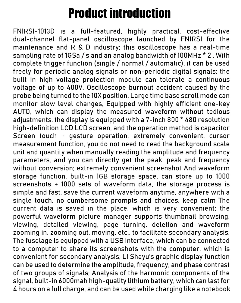 Особенности:Интеллектуальная защита от ожогов, 1X Выдерживает напряжение до 400 В.100 МГц аналоговая полоса пропускания @ 1GSa/s частота дискретизации (1X = 5 МГц, 10X = 100 МГц).Полностью подходит для 7 дюймов 800*480 цветной TFT ЖК-дисплей с яркими цветами и высокой контрастностью.Емкостный сенсорный экран, такой же, как и Сенсорный режим современного мобильного планшета, не является резистивным сенсорным экраном с древней операцией ногтей.Диапазон высокого напряжения, 1x может измерить 0 ~ 40 В, 10x может измерить 0 ~ 400 В, 100x может измерить 0 ~ 4000 в.До 12 параметров измерения: VPP,VP,Vmax,Vmin,Vavg,Vrms, частые, Duty +,Duty-,Time +,Time-,Period.Функция измерения курсора, удобно вручную измерять период, частоту и напряжение.Полная функция запуска (одиночная, нормальная, автоматическая).В любое время дисплей формы волны (Функция паузы) заморожен.Оснащен высокой эффективностью одной кнопкой авто.Одна кнопка хранения сигналов и скриншот.Встроенная память объемом 1 ГБ позволяет хранить до 1000 скриншотов + 1000 наборов данных волноводной формы.Мощный Графический менеджер поддерживает просмотр эскизов, просмотр, Детальный просмотр, поворот страницы, удаление и масштабирование формы волны, масштабирование, перемещение и т. Д.Оснащен интерфейсом USB, который может быть подключен к компьютеру, чтобы поделиться скриншотами с компьютером, что удобно для вторичного анализа.Функция графического дисплея Lissajous может использоваться для определения амплитуды, частоты и фазового контраста двух групп сигналов.Функция отображения FFT, может анализировать Спектральные характеристики сигнала.Встроенный перезаряжаемый литиевый аккумулятор емкостью 6000 мАч, полностью заряжен в течение 4 часов непрерывного использования при максимальной яркости экрана.Технология сжатия памяти, экран обновления формы волны не мерцает.Регулировка яркости экрана.Регулировка яркости фоновой сетки.Ультратонкий, легко носить с собой.Характеристики:Материал: АБС-пластикЦвет: черный + белыйШирина аналогового ремешка: 100 МГц * 2Количество каналов: 2 каналаМаксимальная частота дискретизации в реальном времени: 1GSa/sВертикальная чувствительность: 50 мВ/див ~ 500 В/ДивГоризонтальный диапазон времени: 50S/div ~ 10NS/divМаксимальное тестовое напряжение: 40 В (1X зонд), 400 В (10X зонд)Глубина хранения: 240 кбитВходное сопротивление: 1 мТочность ADC: 8 битРежим соединения: AC/DCРежим запуска: одиночный, нормальный, автоматическийКромка триггера: поднимающаяся кромка/опускающаяся кромкаНапряжение внешнего триггера: 0 ~ 40 вДисплей: 7 дюймов-800*480Работа: емкостный сенсорный экран + жестыУдлинительные порты: экспорт изображений USBИсточник питания: 1 * литиевая батарея, 6000 мАч (в комплекте)Размер изделия: 184*124*50 мм/7,2*4,9 * 2.0inРазмер посылка: 200*134*60 мм/7,9*5,3 * 2.4inПосылка Вес: 986g / 2.2lbУпаковочный лист:1 * ADS1013D хост осциллографа2 * соответствующий зонд 100 МГц (1X и 10X)1 * USB кабель1 * Руководство пользователя