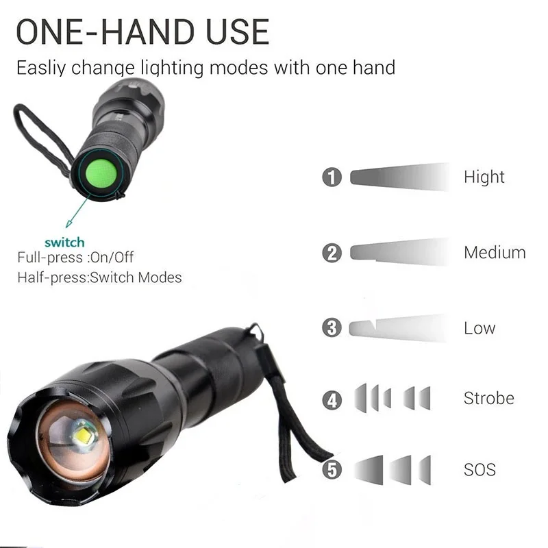 Есть 5 режимов работы: высокий/средний/низкий/Стробоскоп/SOS