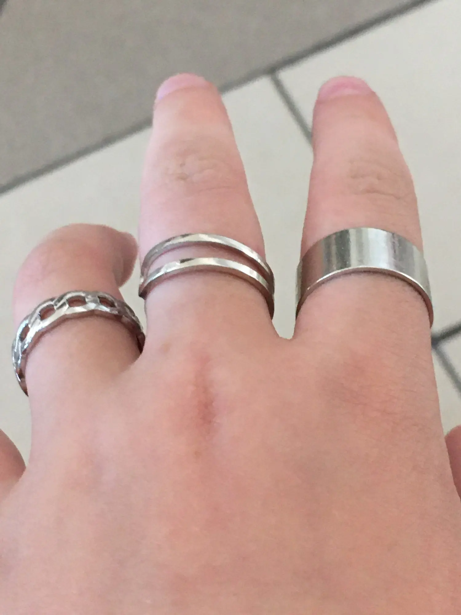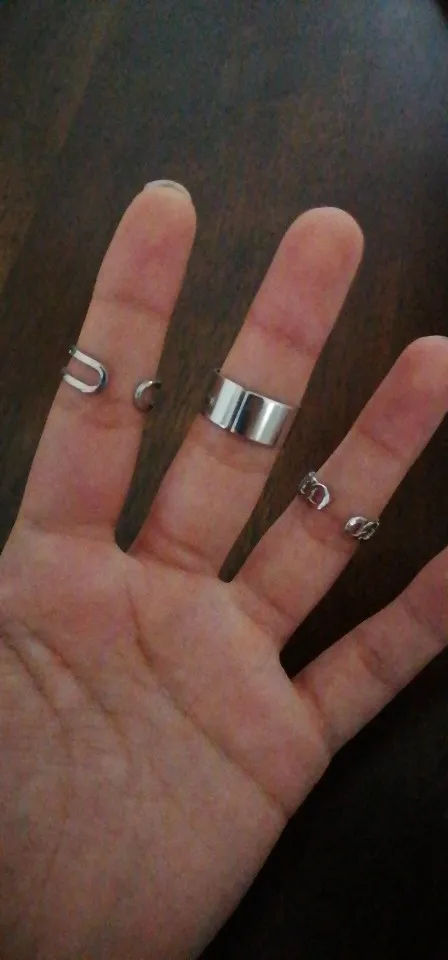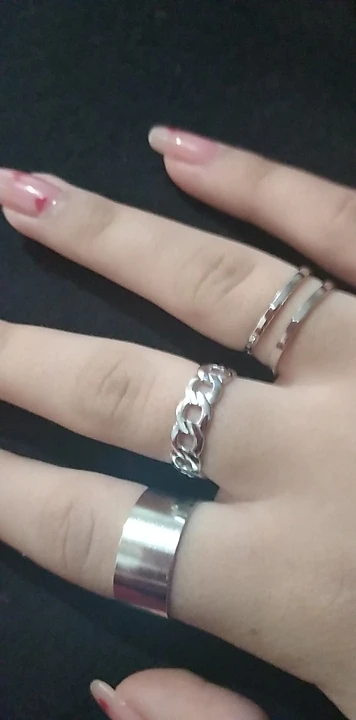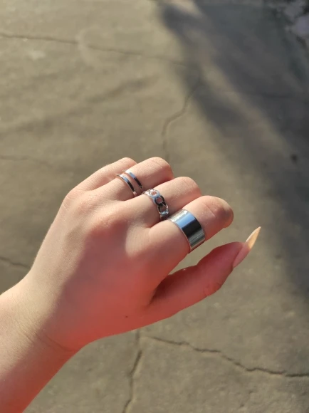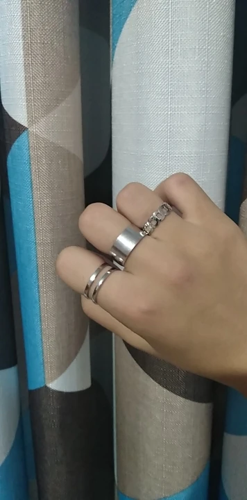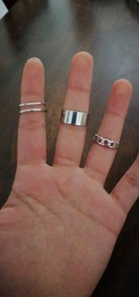 Набор состоит из трёх стильных колечек, которые носить можно по разному, комбинируя между собой. Регулируемый размер позволяет надевать на любой мальчик, что очень удобно. Качество нормально , на широком кольце есть царапина , но за такую цену это простительно, в глаза сильно не бросается.