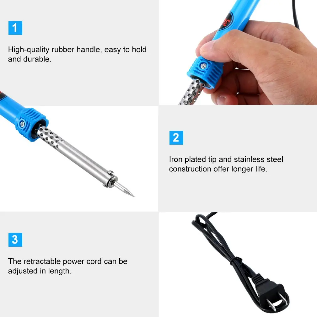 Этот продукт является внешне нагреваемым заостренным электрическим паяльником с резиновой ручкой, который легко держать и очень подходит для обслуживания электронных продуктов, компьютерного оборудования, часов и других предметов.