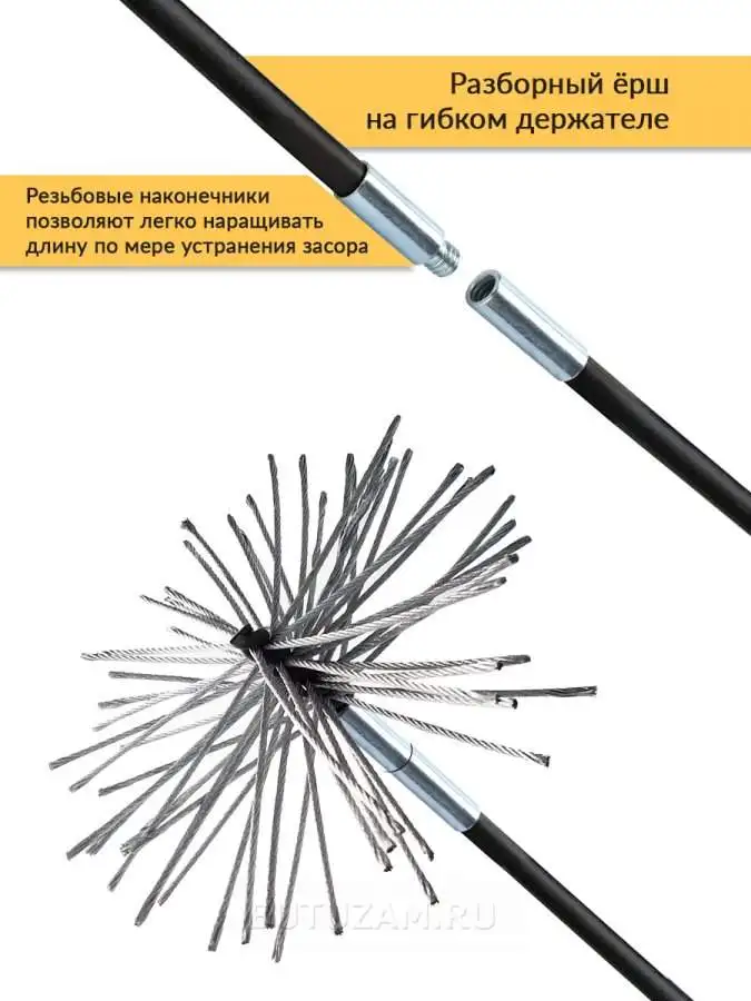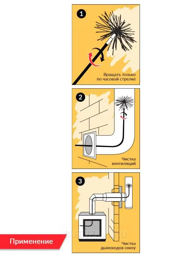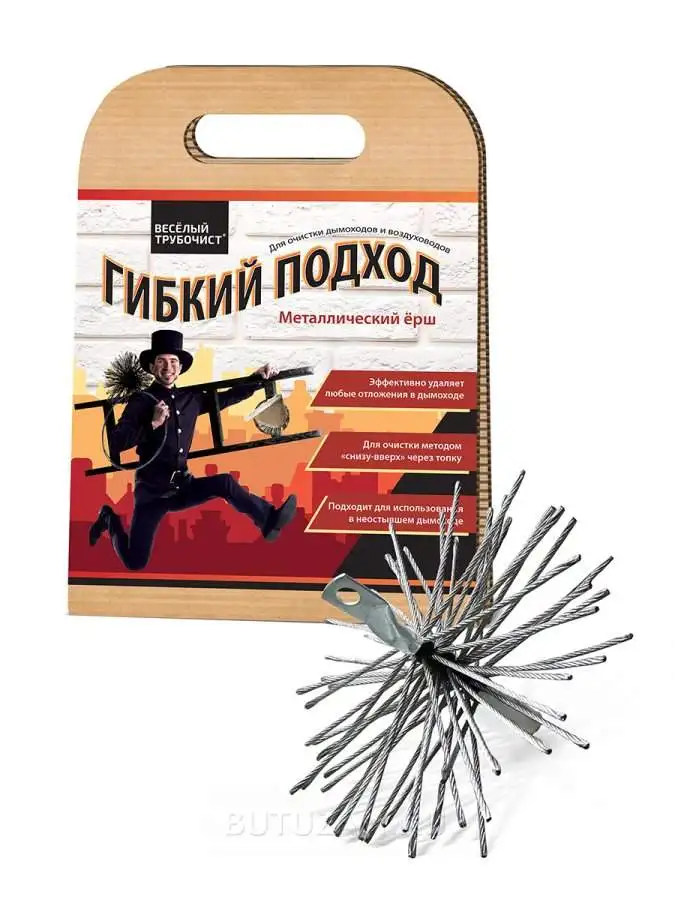 Способ применения:ИСПОЛЬЗОВАНИЕ 1. Подсоедините ёрш к любому стержню. 2. Вставьте ёрш в дымоход через топку. 3. По мере прохождения ерша по дымоходу наращивайте длину держателя. ПРИМЕЧАНИЕ: К держателю с наконечником можно прикрепить дрель для более эффективной очистки. ВНИМАНИЕ! ВРАЩАЙТЕ СБОРКУ ЕРША / СТЕРЖНЯ ТОЛЬКО ПО ЧАСОВОЙ СТРЕЛКЕ. ПЕРЕКЛЮЧЕНИЕ НАПРАВЛЕНИЯ МОЖЕТ ПРИВЕСТИ К РАЗВИНЧИВАНИЮ КОНСТРУКЦИИ ВНУТРИ КАНАЛА ДЫМОХОДА. 4. Поворачивая по часовой стрелке, осторожно вдавите и потяните ёрш несколько раз. Повторяйте до тех пор, пока дымоход не станет чистым по всей длине. ВНИМАНИЕ! если ёрш застрял, не проталкивайте его глубже, слегка потяните его на себя продолжая вращать по часовой стрелке, затем медленно продвиньте вперед. 5. Ёрш свободно продвигается вперед и назад – значит, дымоход полностью очищен. ПРИМЕЧАНИЕ. Таким же образом ёрш может быть использован для очистки воздуховодов