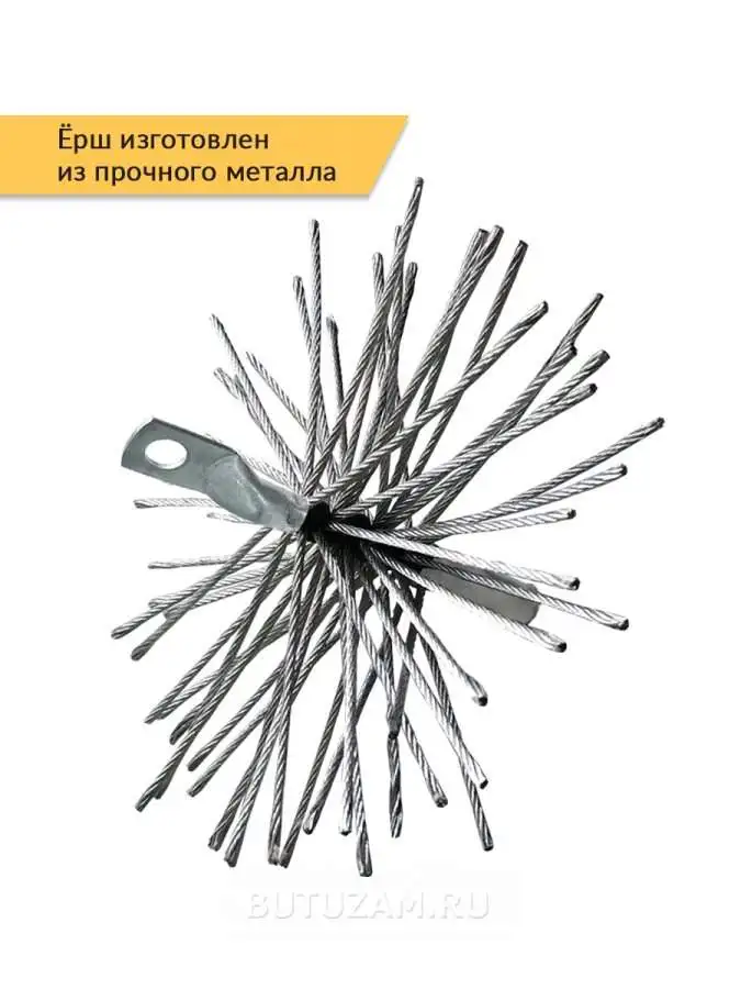 Предназначено для прочистки дымоходов снизу: через ревизионные отверстия, топки печей и каминов. Так же подходит для чистки вентиляционных шахт и воздуховодов. ОСОБЕННОСТИ: - выполненный из металла, ёрш может быть использован даже в неостывшей топке