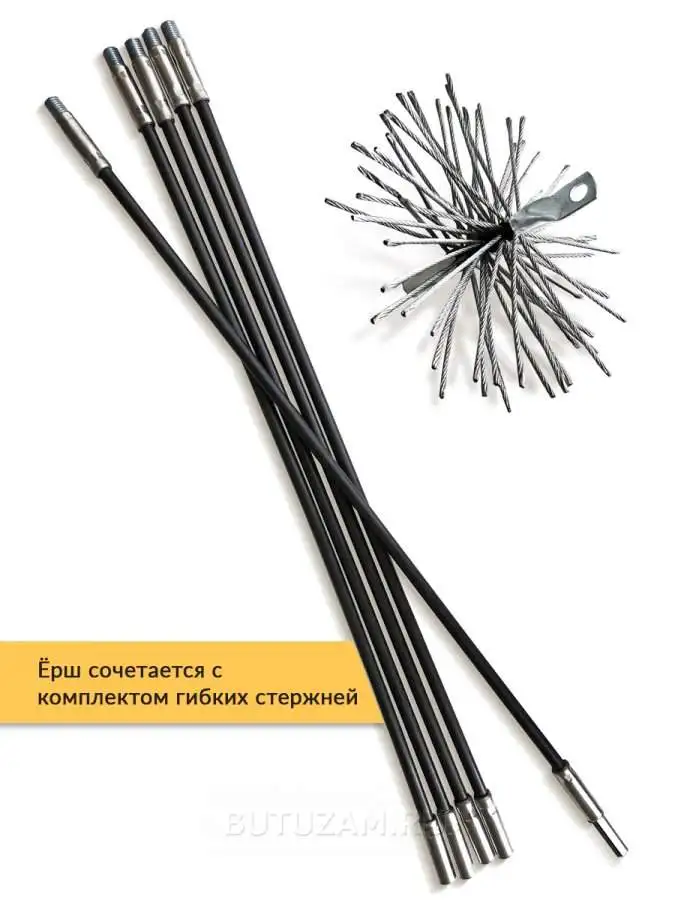 Металлический ёрш эффективно удаляет любые отложения на стенках труб, даже застарелые и твердые. Сочетается с комплектом гибких стержней из упругого пластика, которые позволяют без труда пройти дымоход сложной конфигурации, имеющий изгибы и даже прямые углы