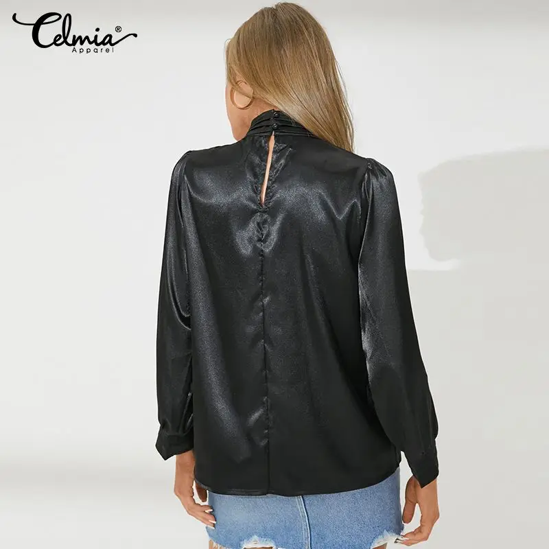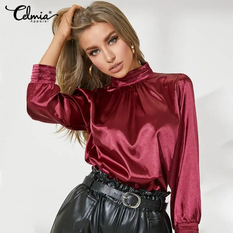 Модная атласная блузка Celmia 2021, женские элегантные офисные топы, однотонная шелковая рубашка с высоким воротником, праздвечерние чные блузки с рукавами-фонариками