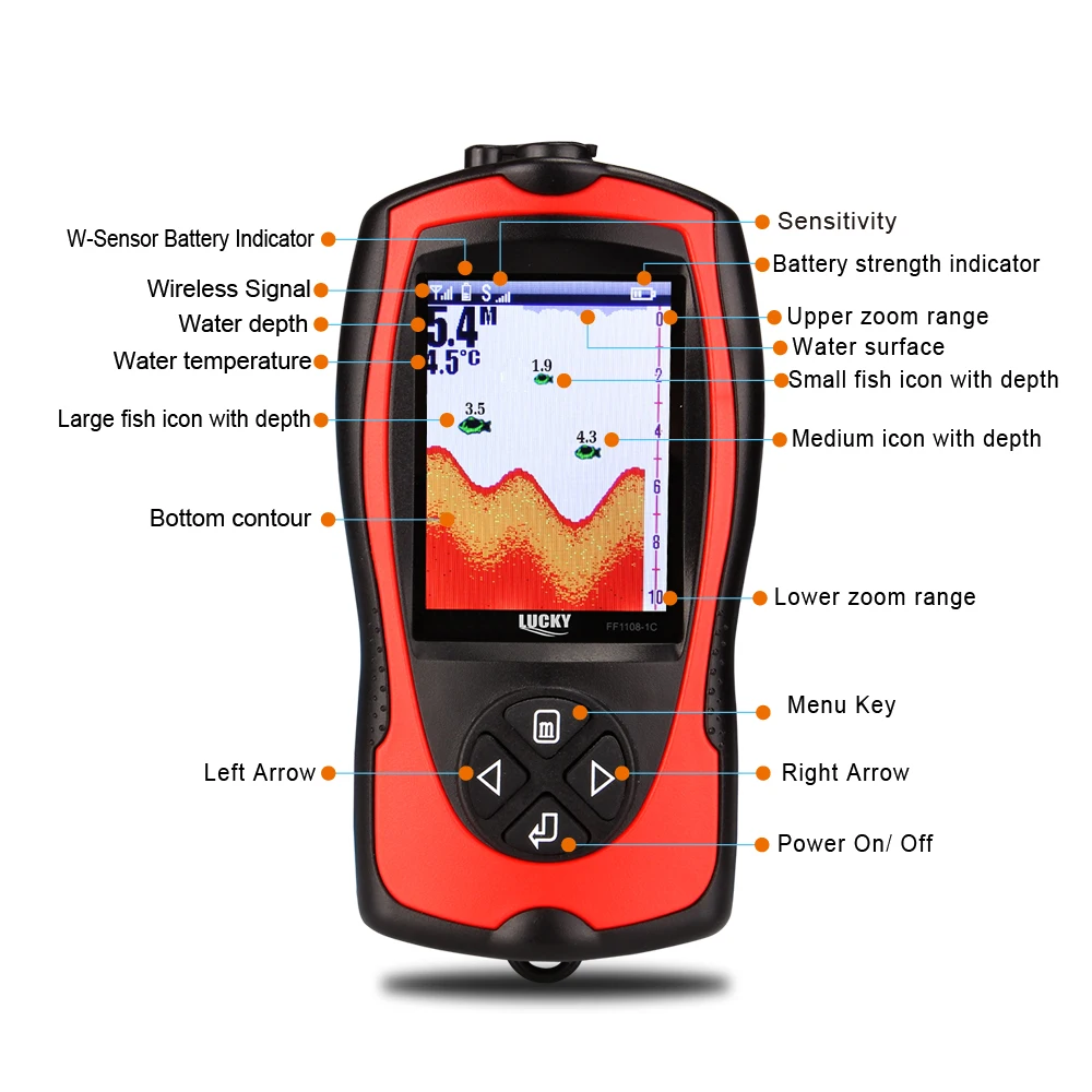 Эхолот-рыболокатор LUCKY FF1108-1CT, портативный, глубина 100 м, проводной детектор рыбы, цветной ЖК-дисплей TFT 2,4 дюйма, локатор для рыб
