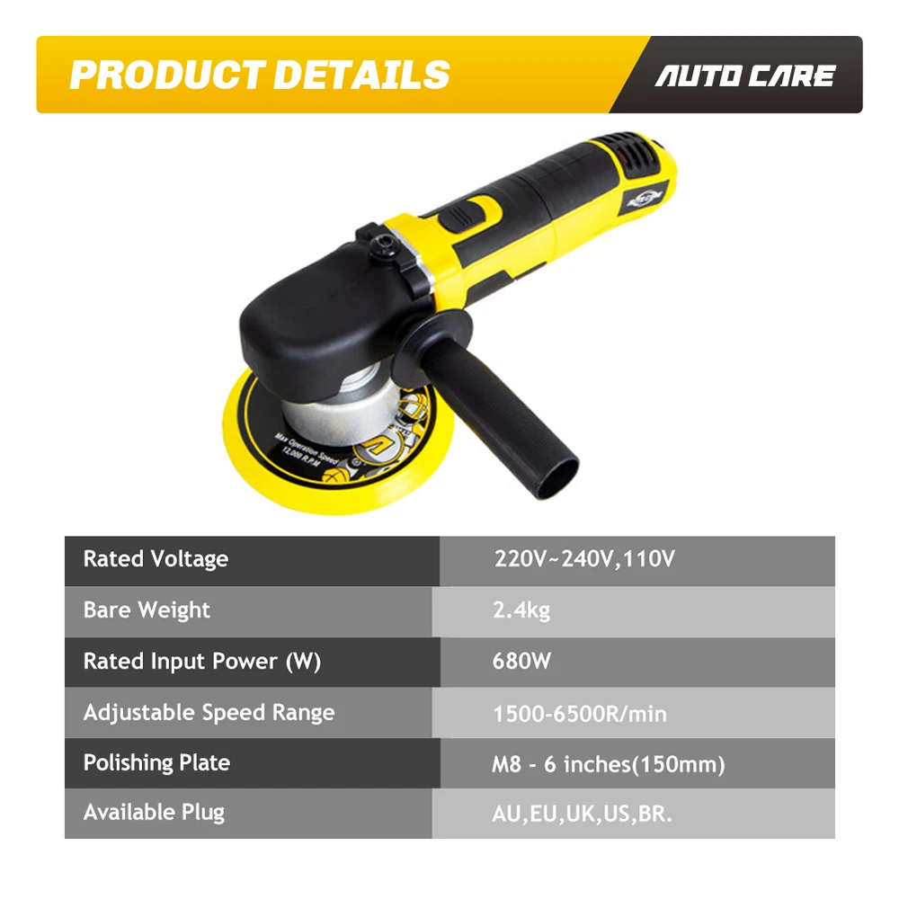 Материал: АБС-пластик Потребляемая мощность: 600 Вт Напряжение: 220/110V Полировальные орбиты: 2500-7200 об/мин Диаметр диска: 150 мм/6 дюймов Доступны вилки: ЕС и США (пожалуйста, оставьте нам сообщение, какой разъем вам нужен, или мы отправим только вилки ЕС, спасибо)