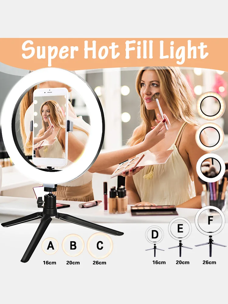 Посылка включает в себя:A: лампа 16 смB: лампа 20 смC: лампа 26 см + кронштейн для телефонаD: лампа 16 см + штатив 19 смE: лампа 20 см + штатив 19 смF: лампа 26 см + кронштейн для телефона + штатив 19 см (телефон в комплект не входит)Название: круговой светильник светодиодный светильник для фотосъемки, Настольный светильник для фотосъемки, кольцевой светильникМощность: 5 Вт/12 ВтИнтерфейс: 1/4 универсальное винтовое отверстиеКалибр: 16 см/20 см/26 смВ комплект входит: пульт дистанционного управления USBДлина кабеля: около 200 смСветильник Цвет: белый светильник, теплый светильник (желтый), мягкая светильник (белый и желтый смешанный)
