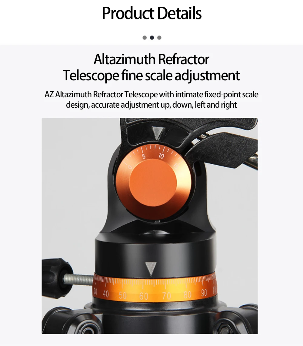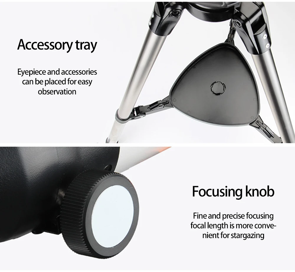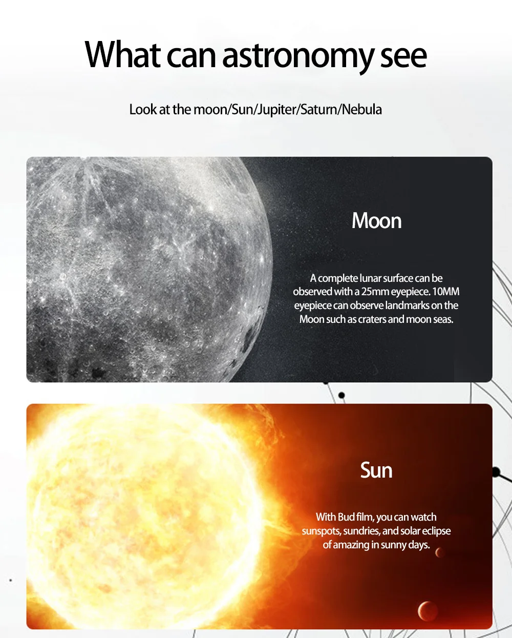 1. Высококачественный алюминиевый сплав: вам не придется беспокоиться о поломке2. Красивый внешний вид больше подходит для стимулирования интереса детей3. Один год гарантии4. У нас есть видео установки, легко установить5. Бесплатный держатель Мобильный телефон, так что вы можете использовать свой мобильный телефон, чтобы записать красоту звезд