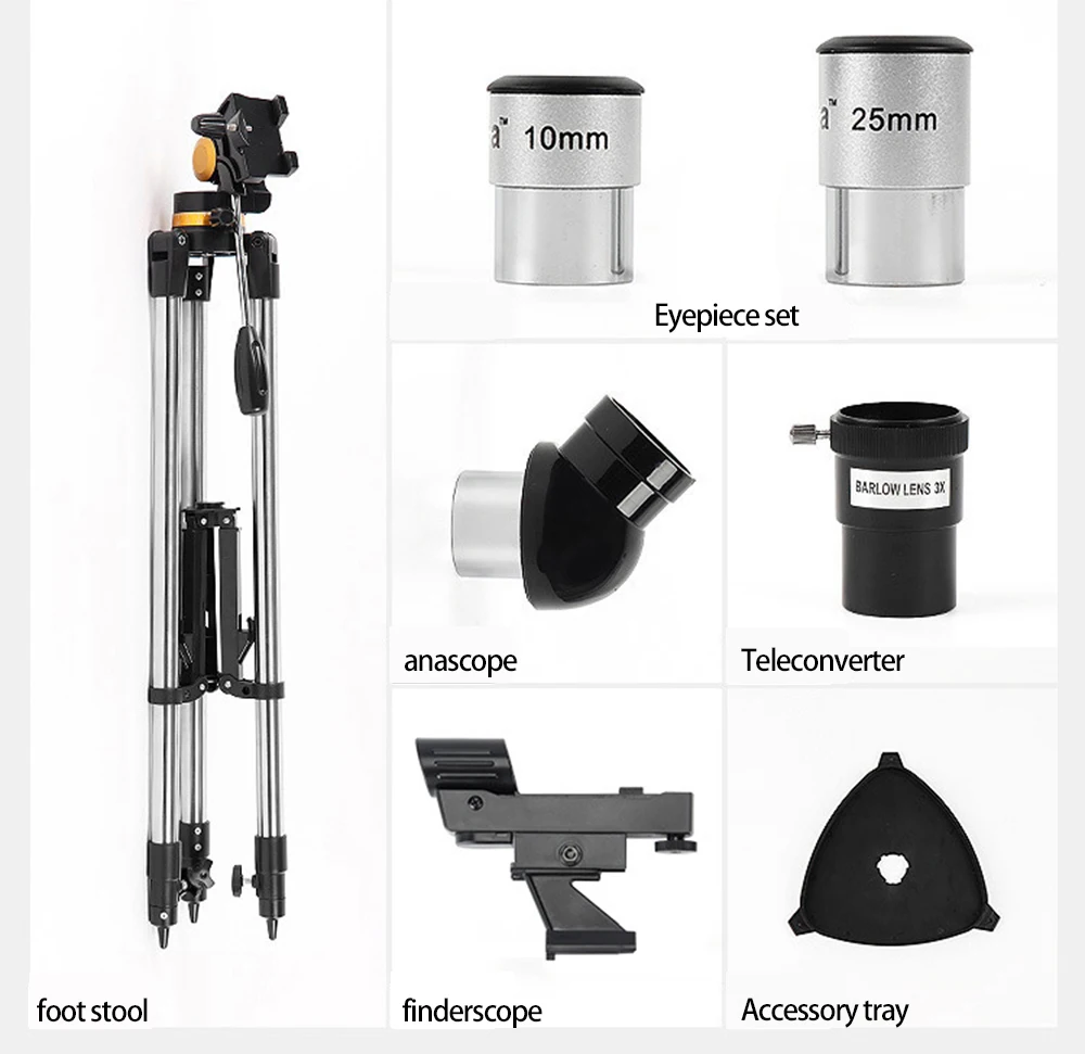 Профессиональный астрономический телескопУвеличение: 150XДиаметр объектива: 70 ммОкуляры: 20 мм, 10 ммМатериал: высококачественный алюминиевый сплав