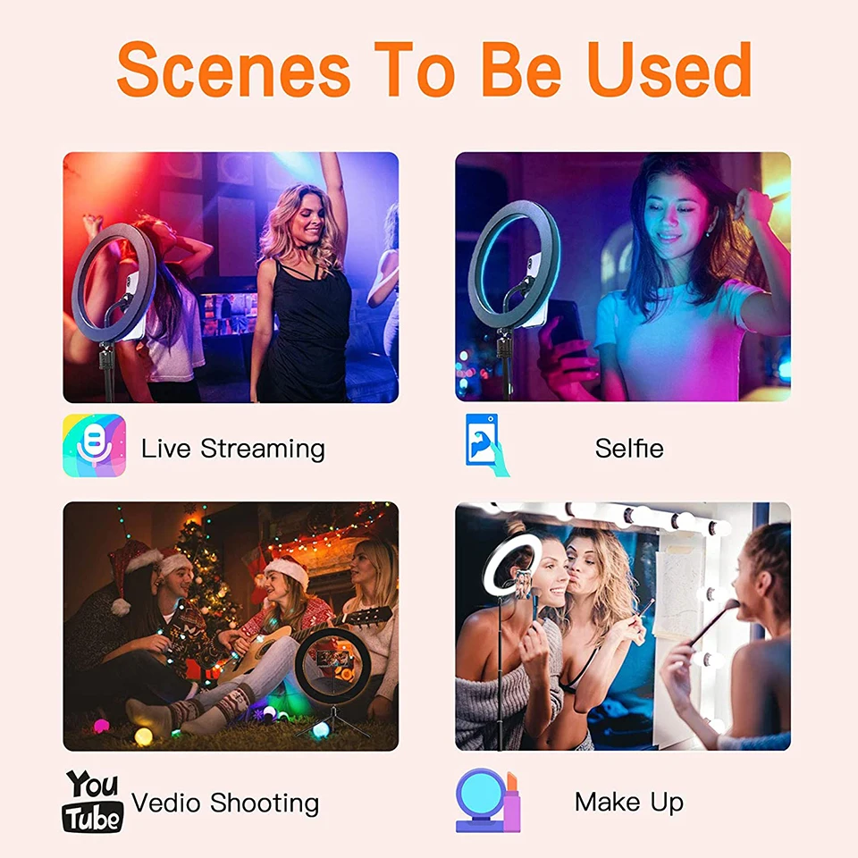 Кольцевой светильник для селфи RGB с подставкой для штатива светодиодный кольцевой светильник для фотосъемки телефона светильник для видеосъемки【3 светильник ing режимов и 32RGB Modes】This с регулируемой яркостью Светодиодная кольцевая лампа светильник с 32RGB цвета светильник и 3 светильник ing режимы: теплый, стихийных бедствий и прохладный, Цветовая температура: 2600K-6500K. Различные цвета для создания естественного эффекта для селфи или видео в разных случаях.【 Вращение на 360 ° регулируемая панорамируемая 】rgb-кольцевой светильник с регулируемой головкой штатива на 360 °, удовлетворит Вас, чтобы отрегулировать угол обзора. Светильник для макияжа с вращающимся держателем для телефона также поддерживает режим портретной съемки (вертикальный) или Ландшафтный режим (горизонтальный) и фиксирует в правильном положении, а также совместим со смартфонами и камерами.【Модернизированный Трипод 】модернизированный штатив 102 см-200 см【Bluetooth беспроводной пульт дистанционного управления и USB powered】совместимость с iPhone/android смартфонов может делать фотографии и снимать видео с помощью беспроводного пульта дистанционного управления. Кольцевая лампа работает с большинством устройств, поддерживающих usb-порт, таких как зарядные устройства USB, ноутбуки, ПК, банки питания